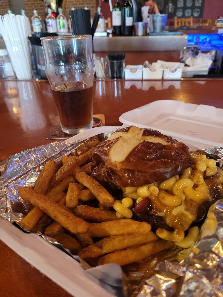 On a road trip and wanted a burger and a beer so we stopped here. Staff was great, super friendly guys, very attentive and eager to help. I got the bacon mac burger and fries, it was so good and the sauce that is on it is stellar! My boyfriend got the burger of the week with tots, which was a queso burger. The burgers were cooked perfectly and the taste was awesome. Needless to say we are both VERY full and very satisfied. :)