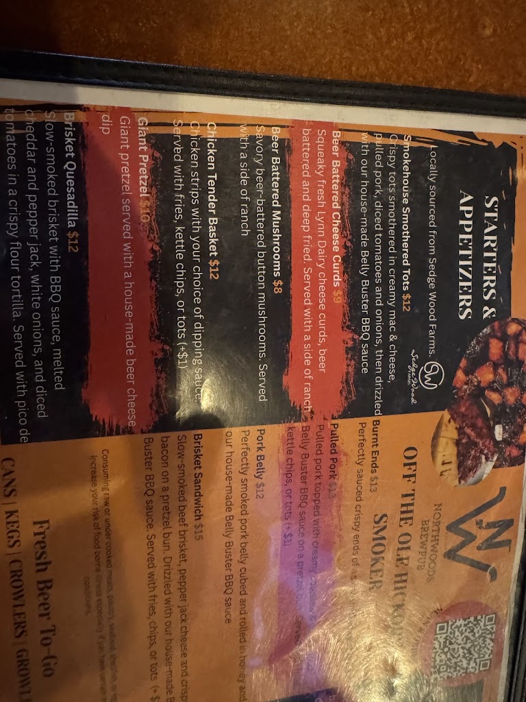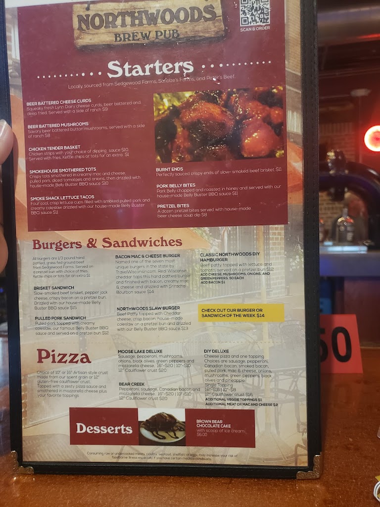 Searched for brewpubs during our travels along Hwy 10 and found Northwoods. It took us a bit of effort to find the place, as there was a lot of road construction and detours in town. But we're glad we made the effort. We were looking for a bit of refreshment in the early afternoon - an IPA for the hubs, a hard seltzer for me, and a shared plate of Smokehouse Smothered Tots. Everything was clean, fresh, and tasty! Thanks.