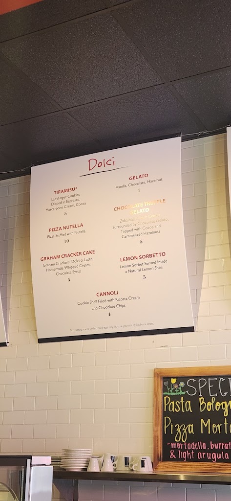 Fantastic pizza to eat in or take out. A variety of fire baked pizzas. Tasty. Usually not heavy on cheese or sauce like a traditional NY pizza - think more like an oven baked gourmet pizza. Options are great and tasty. I hear the tiramisu is good too.
