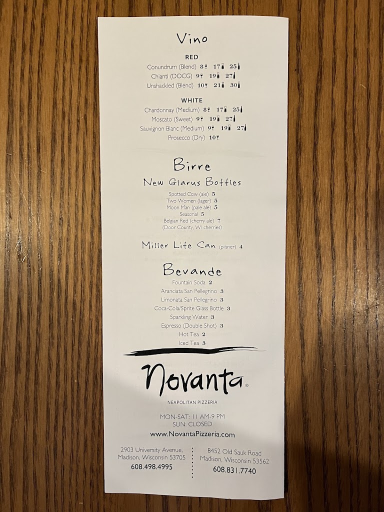 After hiking at Devils Lake for the day, we were looking for a good pizza to finalize our first night of a bachelorette weekend retreat. We were not disappointed. Pizza was excellent - five young women and myself (mom of bride) ordered what we each wanted per our individual tastes. The pizza was hot, filling and excellent. The refillable soft drinks were an additional perk, and the ones that ordered beer/wine were served cold drinks to accompany their meals. Our bride-to-be was even treated with a Nutella pizza! Sadly, we live 4 hours away - so we won't be able to frequent this establishment often - but those who visit Madison or live there - do yourself a favor and check out Novanta. Grazie mille, Novanta staff - for a nice dinner for all of us!