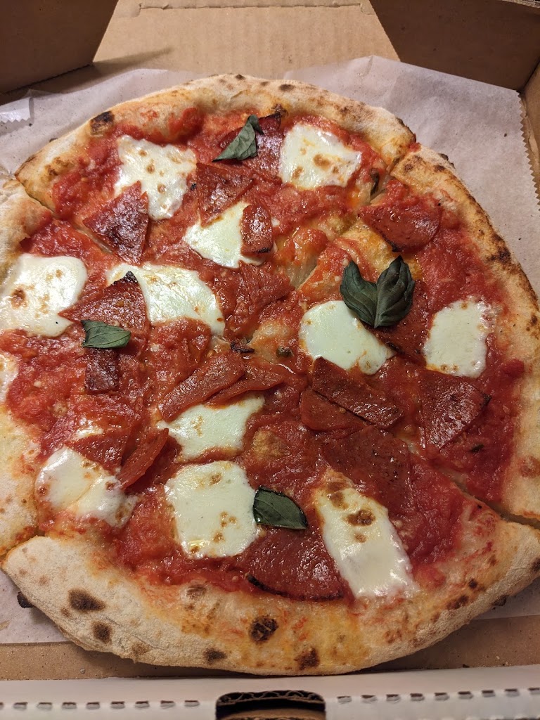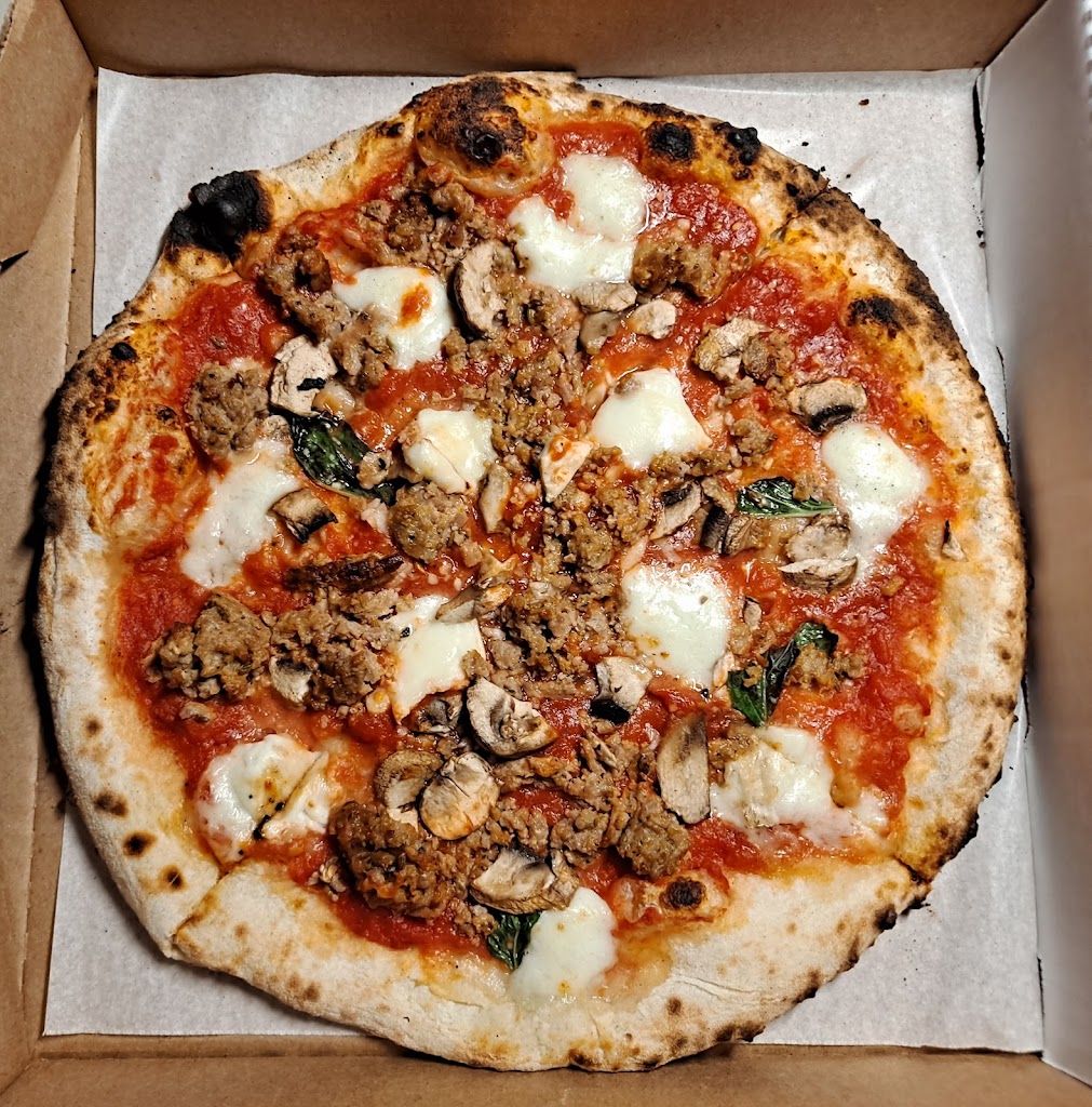 Just as I pulled into their lot, I got a text my pizza was ready. As I walked in, the place smelled phenomenal. The woodfired smoke baking fresh crust and melting cheese. The two workers were extremely friendly and addressed me by name before I even introduced myself. A nice, friendly touch. Thanks guys!