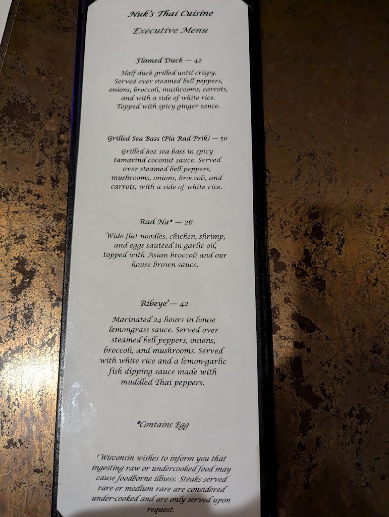 Went there for the first time for dinner. Drink menu is diverse. Food was great especially the duck wings (must try). Pad thai was probably my favorite thus far in green bay. Our server was chloe. She was great as well. Would definitely go back and recommend!