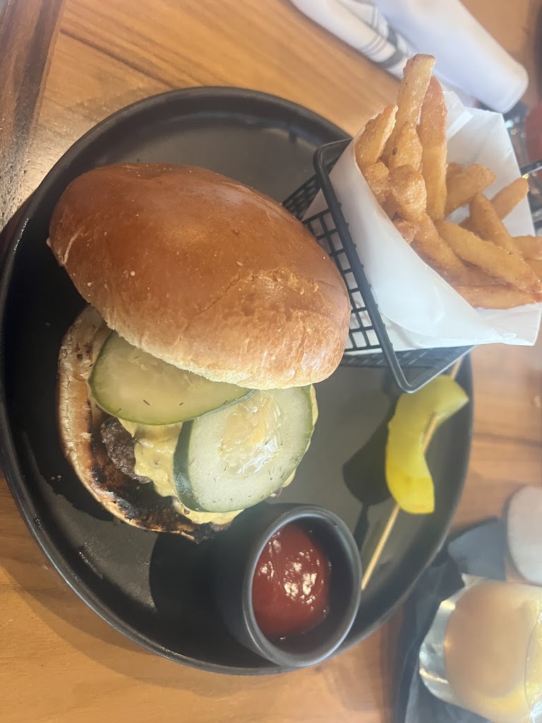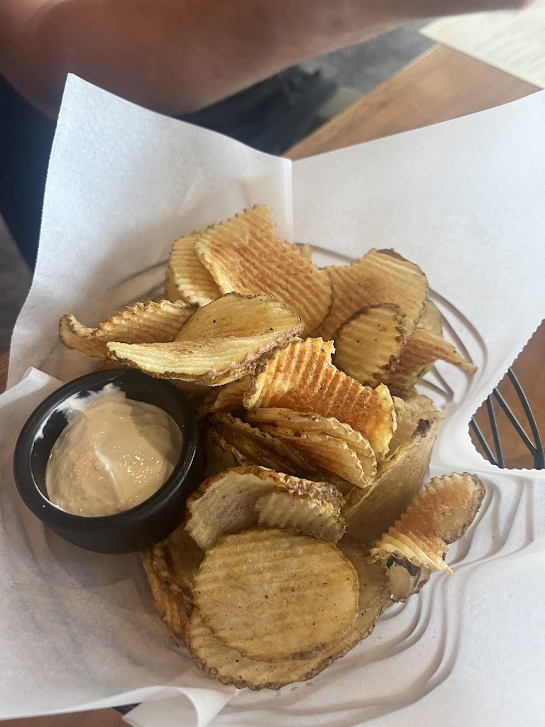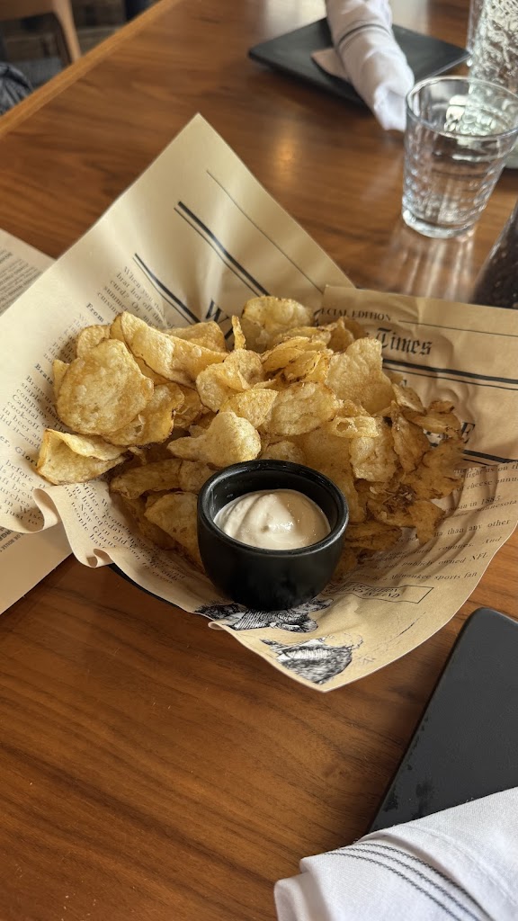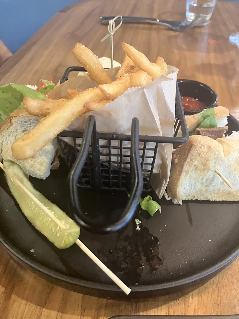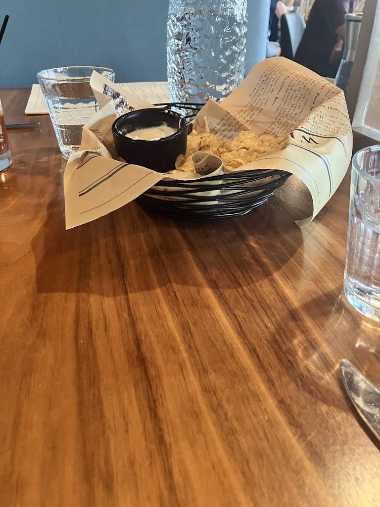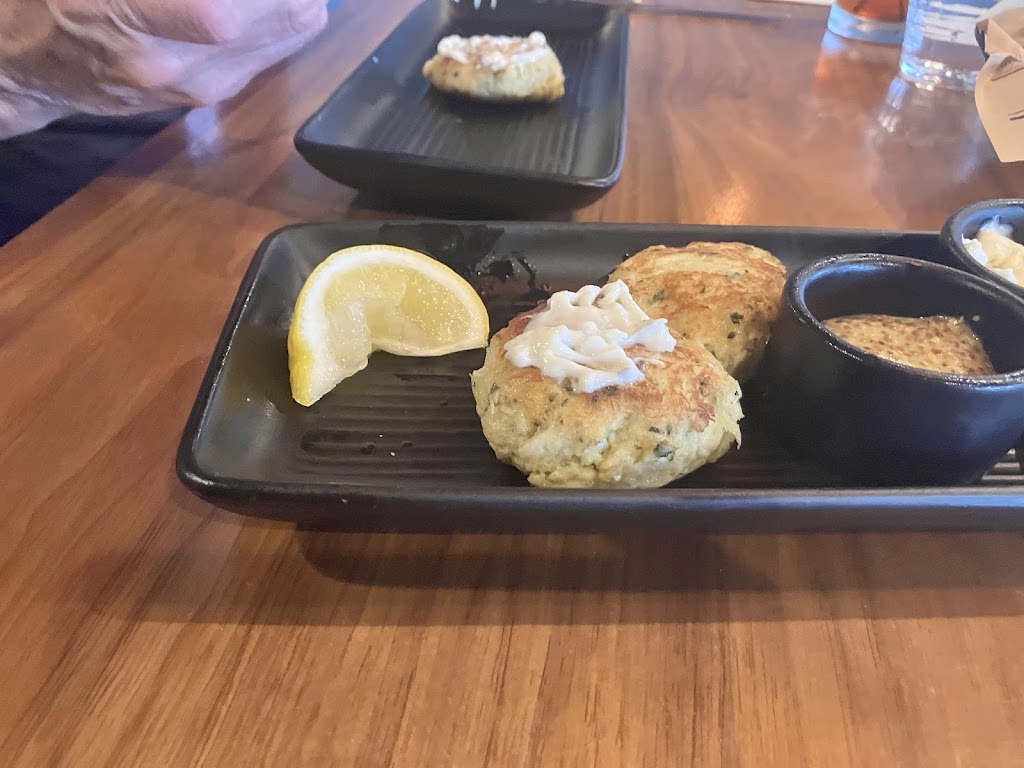 This was the first time we ate at the new reboot. We were given homemade potato chips with a sour cream dip which were complimentary. My husband and I shared the crab cakes that were good. Tartar sauce and a bourbon mustard were included. The mustard didn't go with this. The crab cakes were lightly fried so they didn't have that crunchy top. We then shared the club which was good. They were busy so service was a bit slow. I don't care for fried food so finding something was a challenge. A few healthy options would have been appreciated. I saw the cheese board come out and it looked very nice. Unlike a review here showing some cheese and flatbread. Not sure what happened with yours.