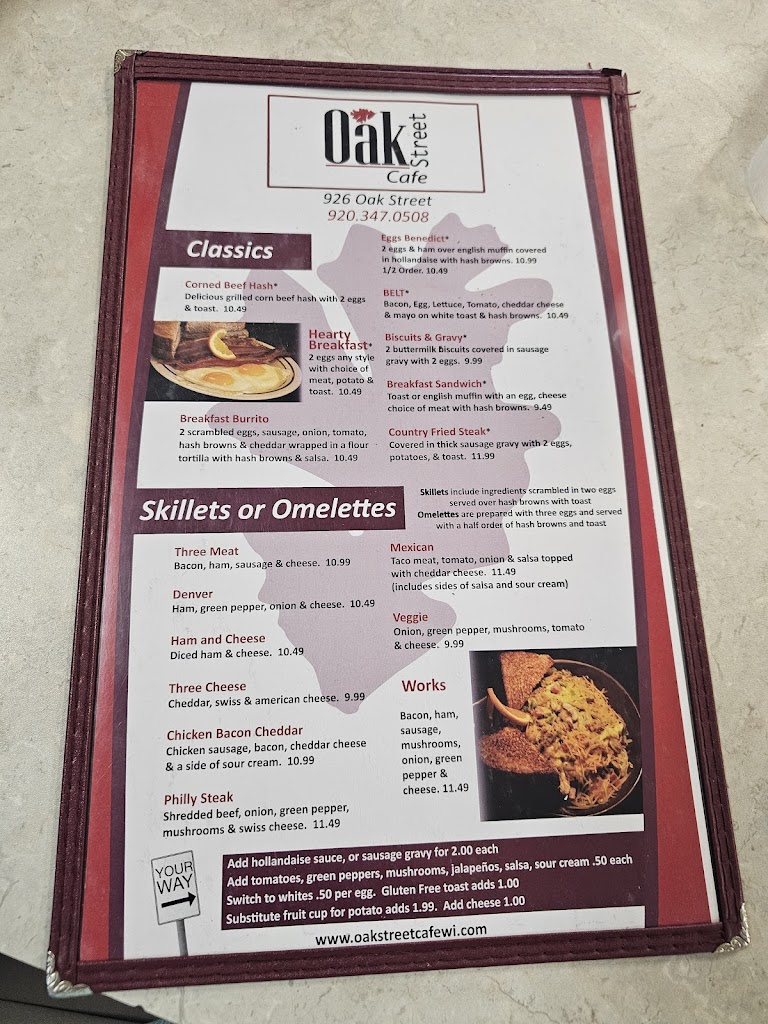 Oak Street Café is located on the West Side of De Pere just two blocks off the Main Street exit of Highway 41. Our Parking lot is behind the restaurant accessible off 10th Street. Parking is also available right on Oak Street.