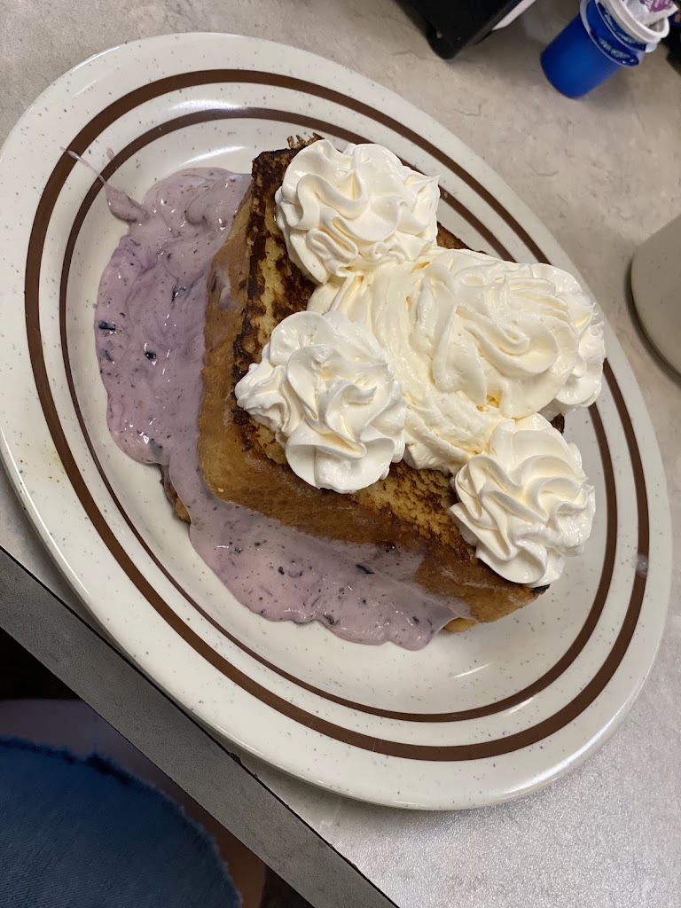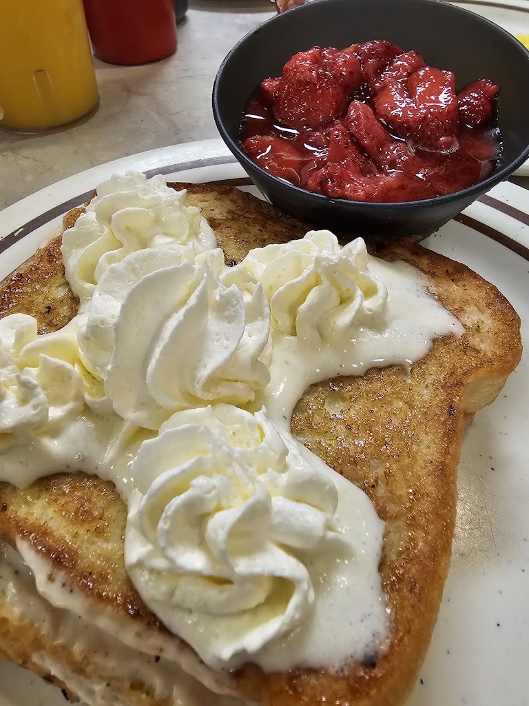 I really enjoy diner food. I tried their chili hash browns. The chili had a slight bite to it and I do wish there were more potatoes with it but still enjoyed it! My husband got their stuffed french toast which is really a French toast sandwich with cream cheese in between. It's topped with strawberries and whipped cream and I loved it!