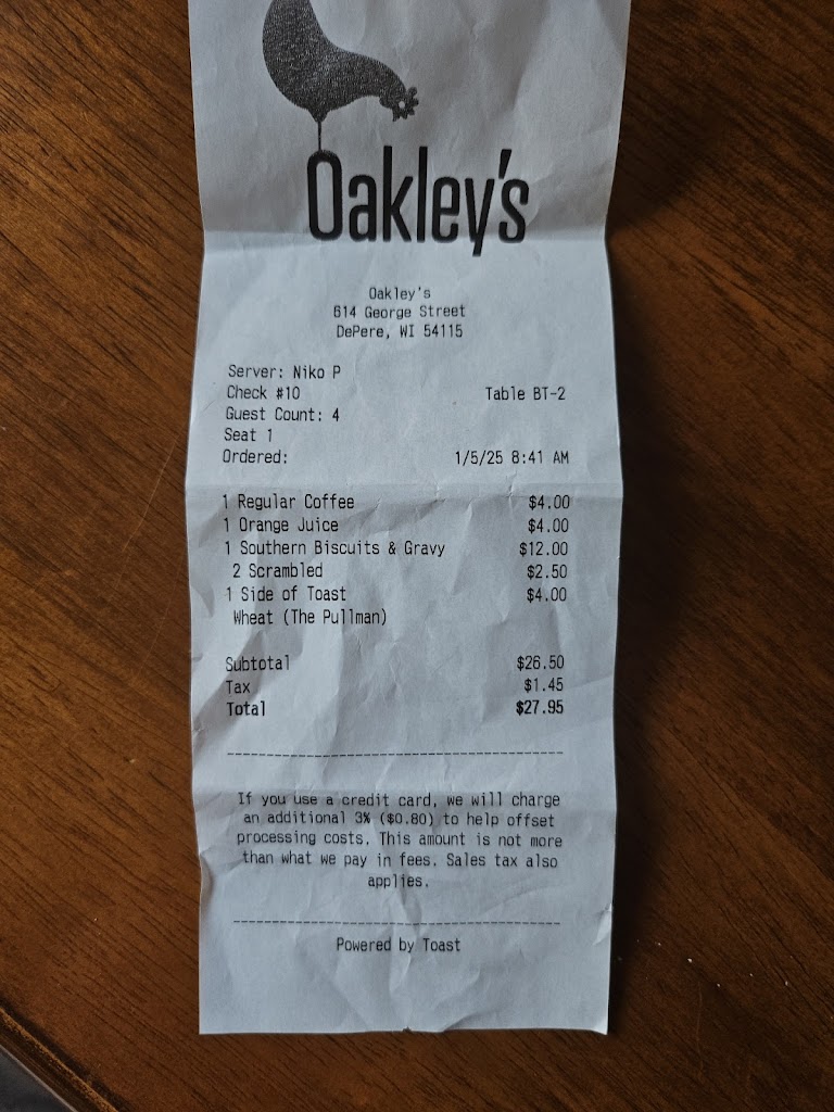 This was my third time at Oakleys. Great atmosphere, clean, very friendly wait staff, delicious food, great bloody Mary’s and mimosas. I highly recommend everyone try this new East DePere gem! 🍳🥞☕️🧇