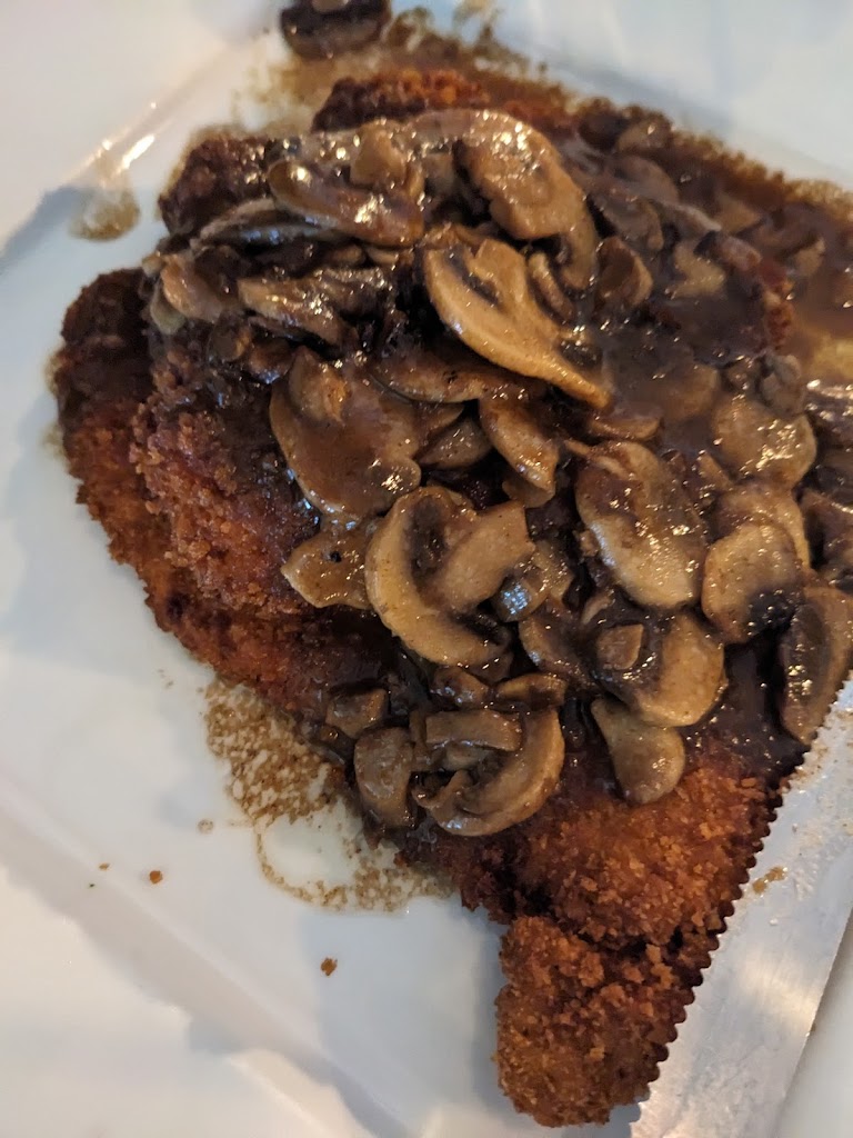 Pork chop smothered with seafood was amazing and enough to feed two or even three!