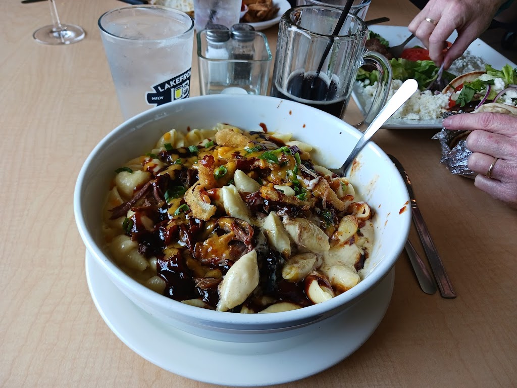 Nachos, curds, perch and steak were delicious. The mac n cheese is huge. Better be hungry!