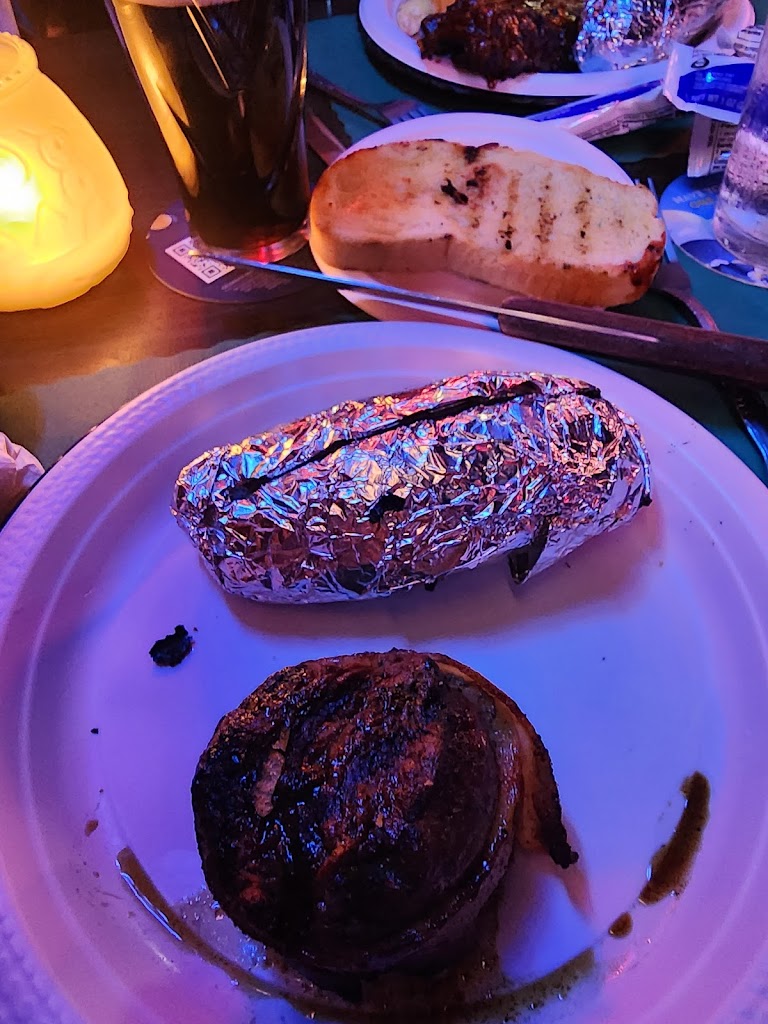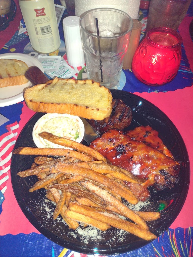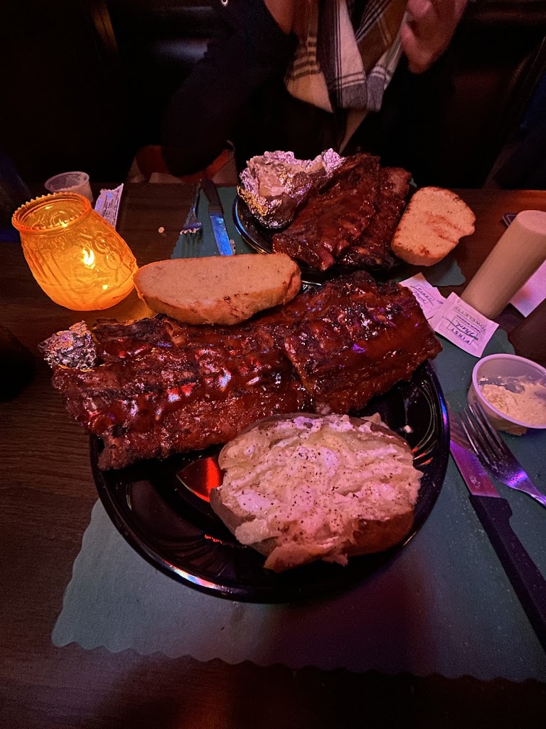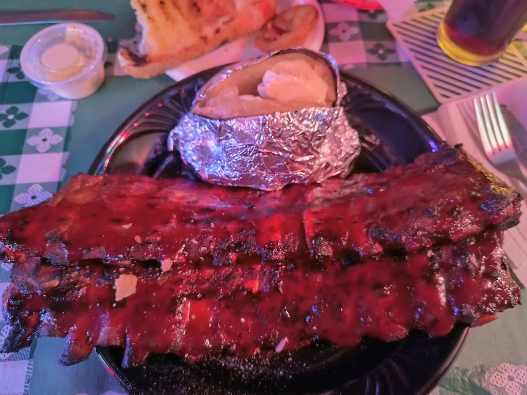 Decent food, I had the ribeye and ribs. The steak was a classic thin cut dinner style I would call it. Ribs were ok, definitely fall apart tender but not super moist. The garlic mashed potatoes were fantastic.