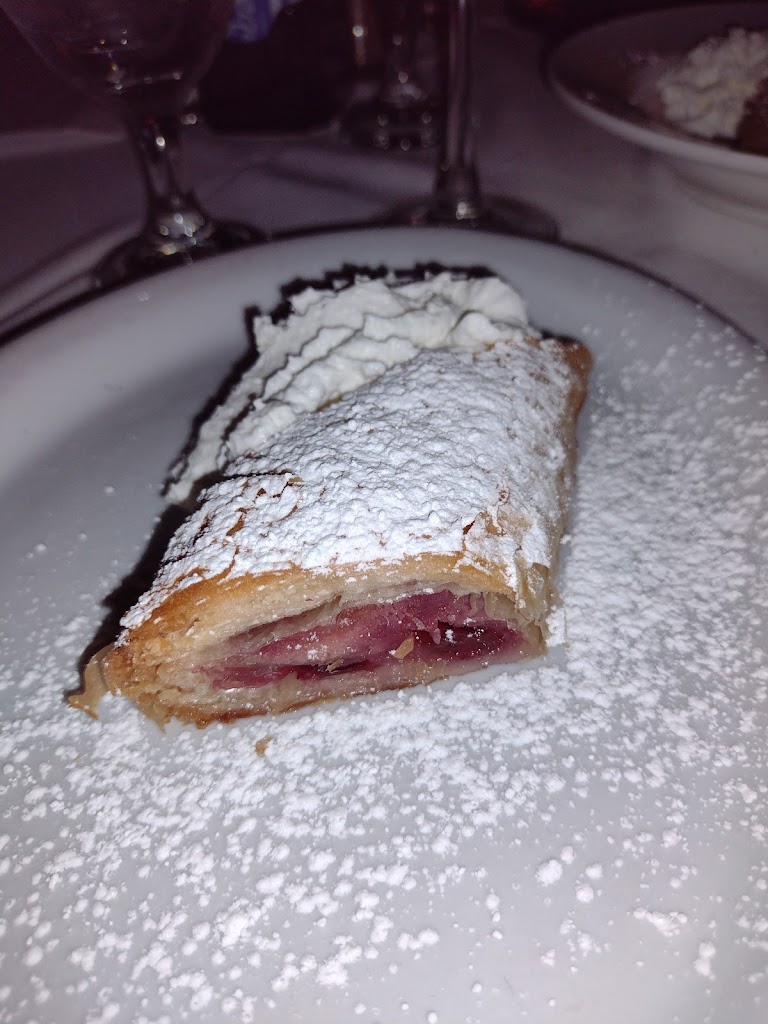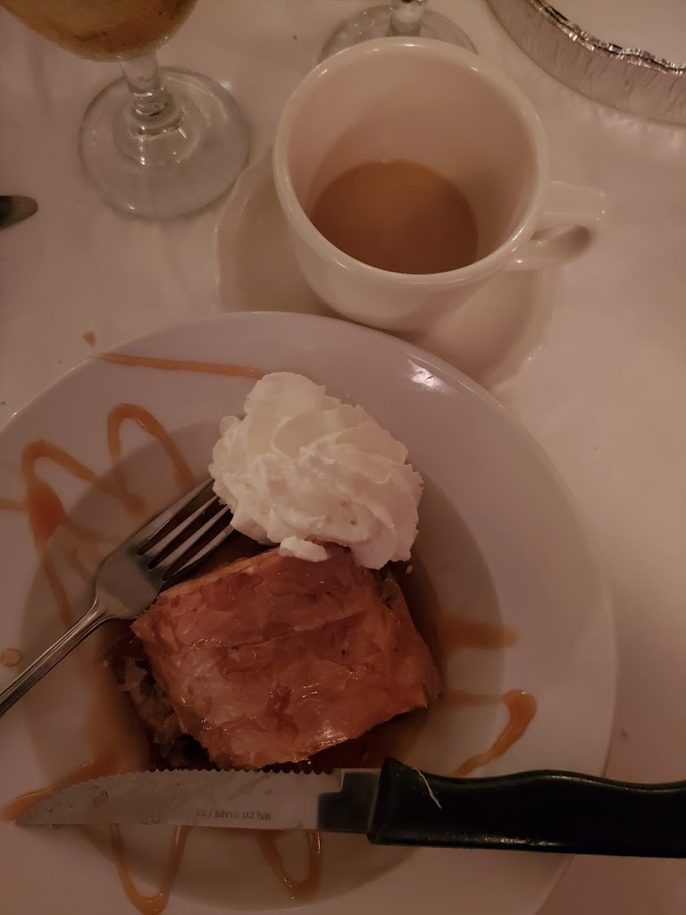 We overindulged with a full appetizer (the baked feta, so delicious and flavorful); entrees: chicken paprikash and sarma (each savory and expertly prepared; the thin cabbage wrapping was of particular note!); desserts: a strawberry torte and palchenka (the torte was light, fluffy and just the right level of sweetness; the crepe was a terrific apple and nut medley). The Serbian coffee was new to me, it had a very earthy and smooth flavor, an excellent compliment to ethereal desserts!