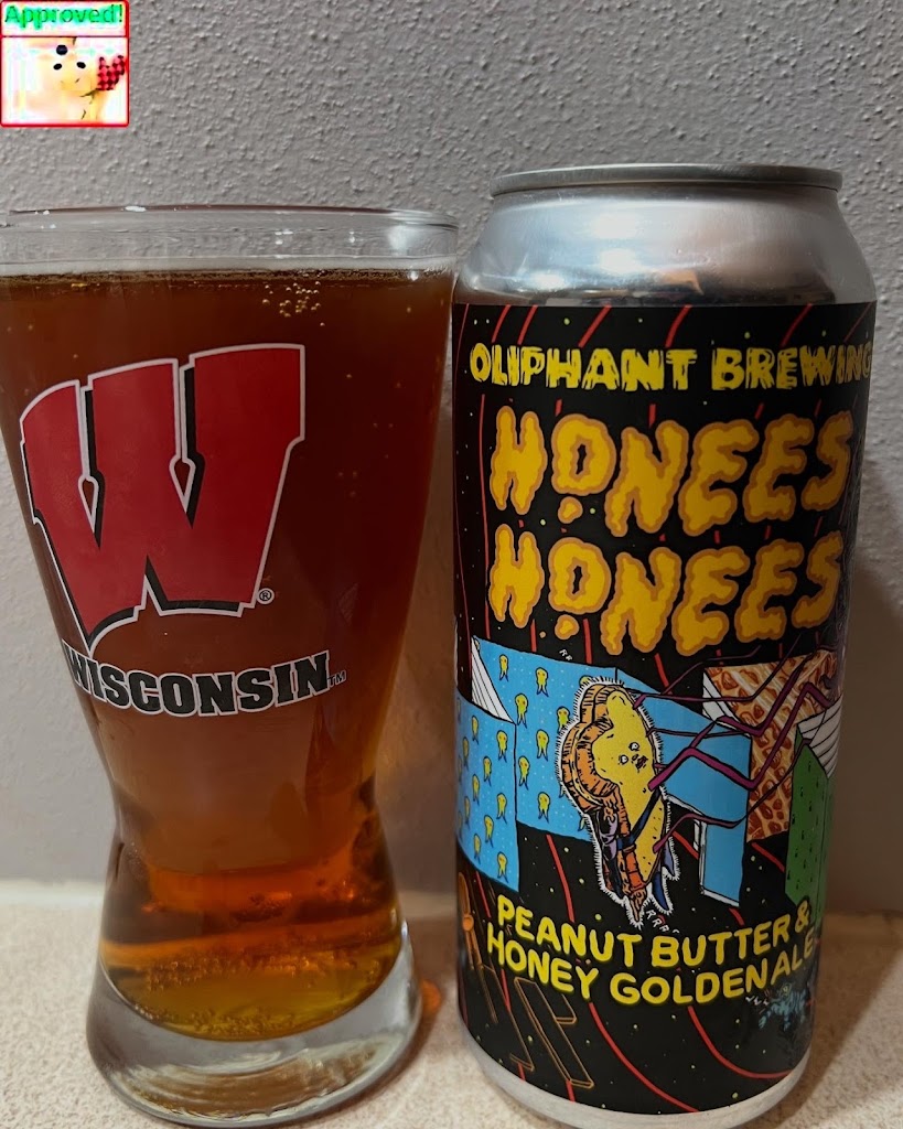 Oliphant Honees Honees: Oliphant Brewing was founded just over a decade ago in Somerset, WI (which is practically MN near the Twin Cities). Being an avid reader, I know never to judge a book by its cover, but the artwork on the can is honestly what got me to check out Honees Honees. It's dubbed a peanut butter & honey golden ale, which is an ale brewed with honey and lactose, with peanut butter flavor and caramel color. The artwork that so powerfully snatched my attention sort of conveys that in its own unique and trippy way. Pouring the ale reveals a clear dark gold/amber color. I found the peanut butter to be stronger on the nose than the palate. Taste favored honey, with hints of peanuts, caramel malts, and a sweet (for a beer) finish. It weighs in at 5.6% ABV. Both the artwork and beer itself are Doughboy approved