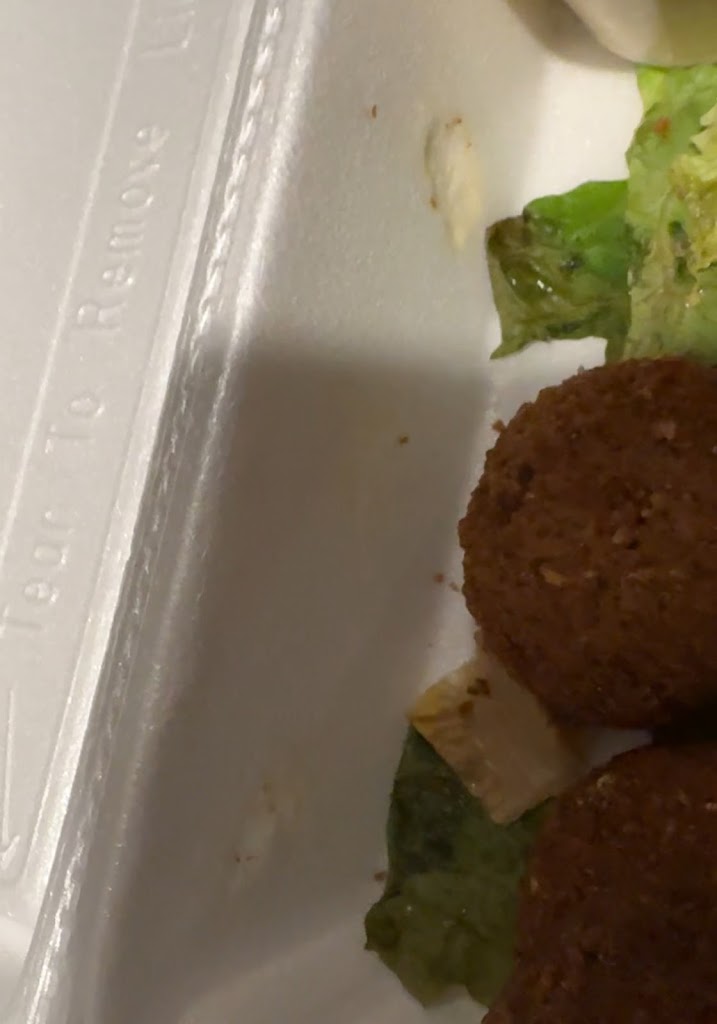 I called customer service to report the issue, and their response was even more frustrating. They claimed that I had asked for the falafel to be "well done," but that doesn’t justify using containers that can’t withstand high temperatures. Just because food is cooked more thoroughly doesn't mean it should be placed in packaging that melts. This shows a lack of basic food safety standards.