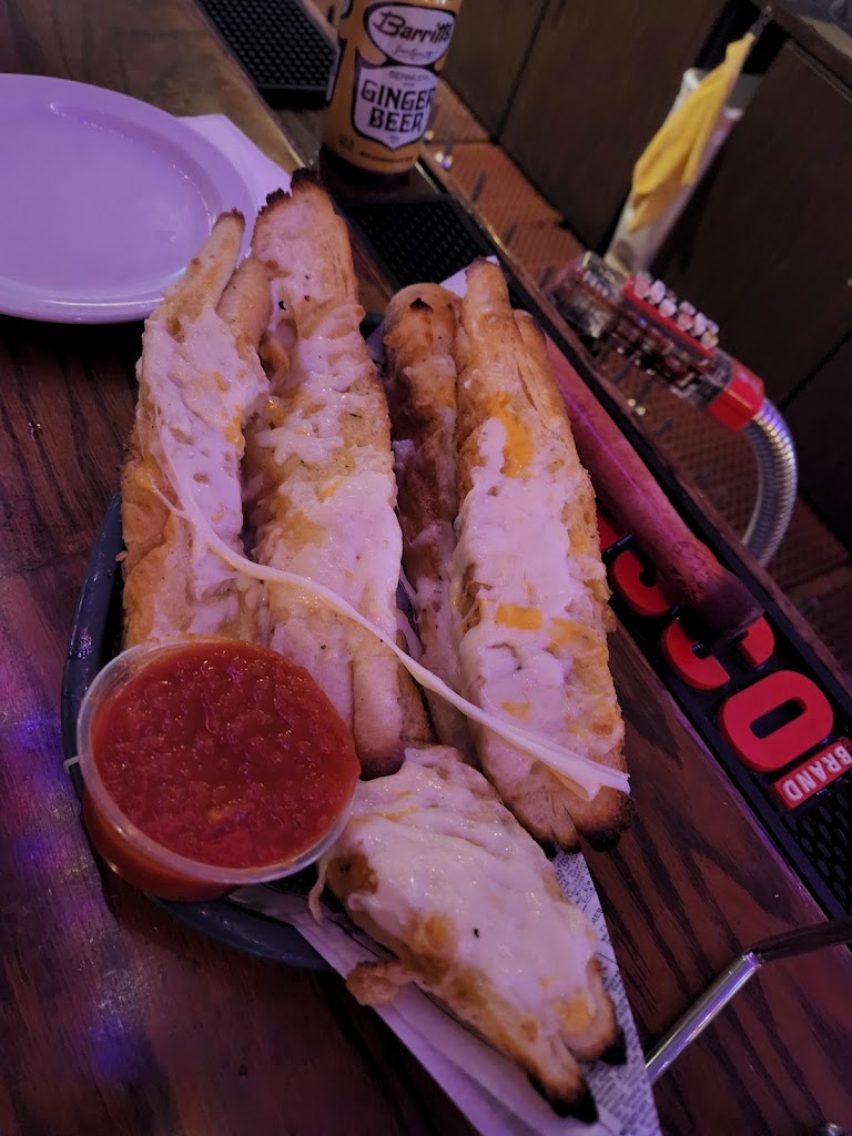 Well we had the pizza and the cheese garlic bread the proportion of the cheese garlic bread was out of this world the bartender with green or blue hair was fantastic I did not catch your name the bathrooms were clean very nice crowd stop in for a pizza it's worth it