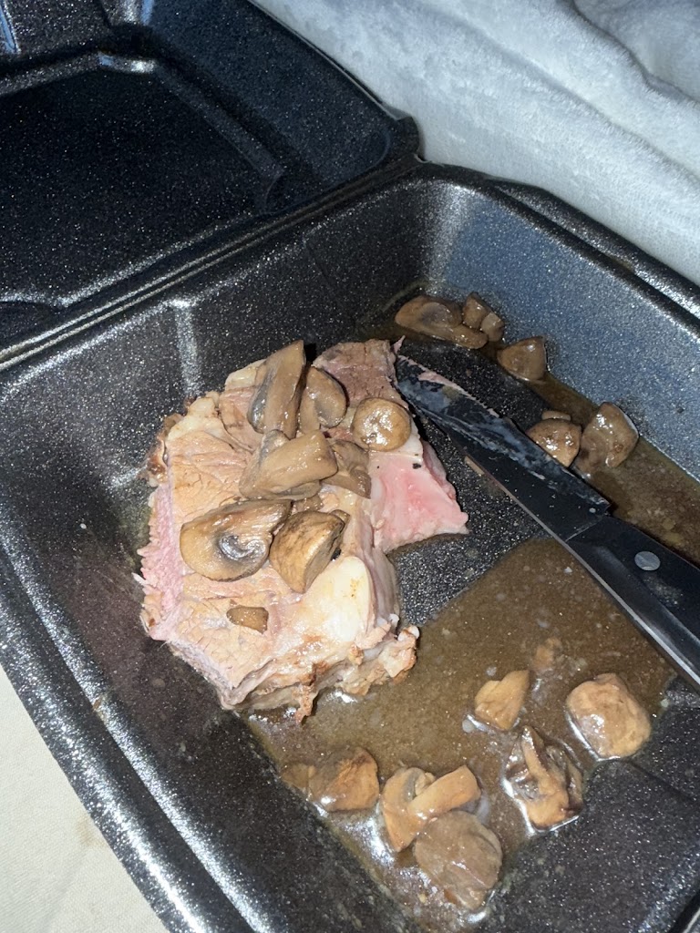 It was oddly flavorless, served with a SWEET glaze/gravy w/ mushrooms. NO au jus or horseradish on the side?!