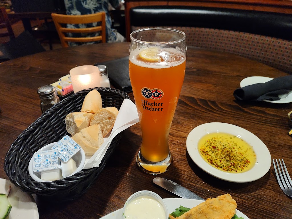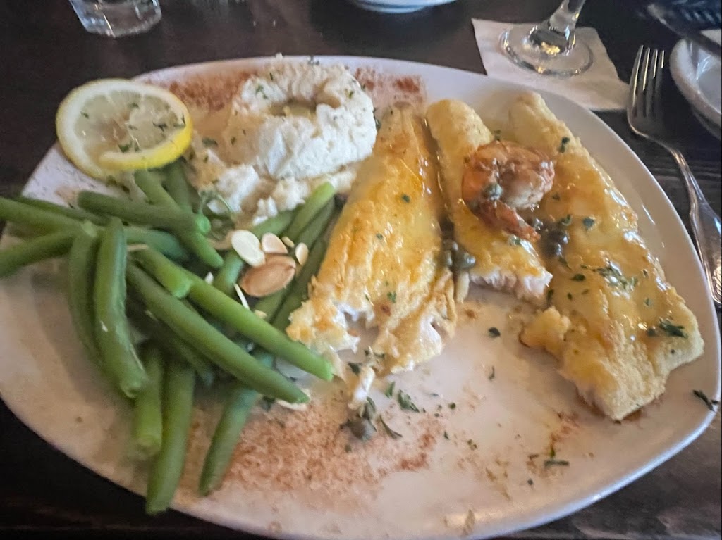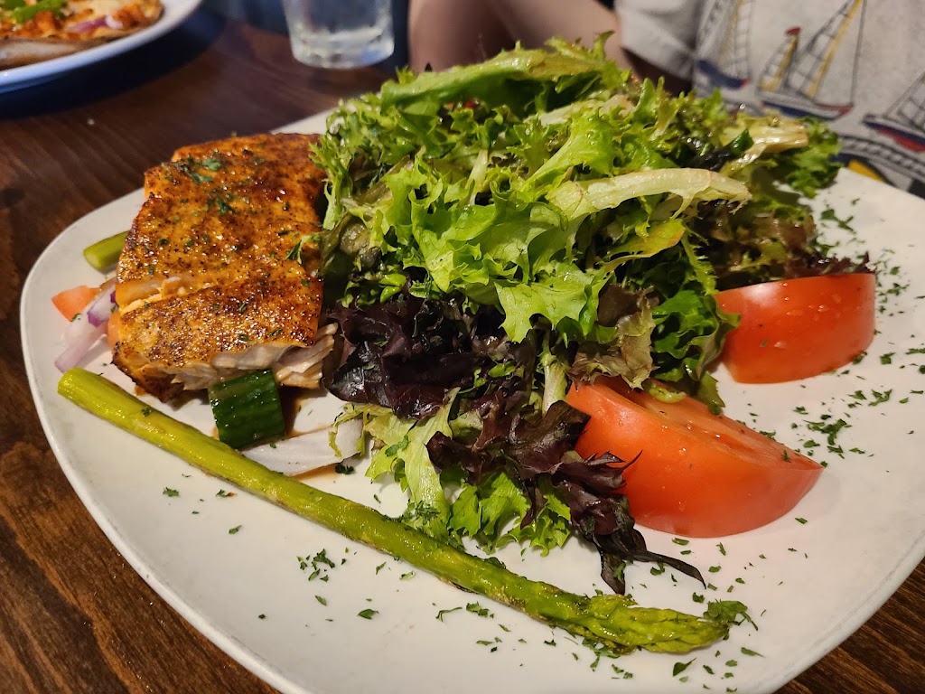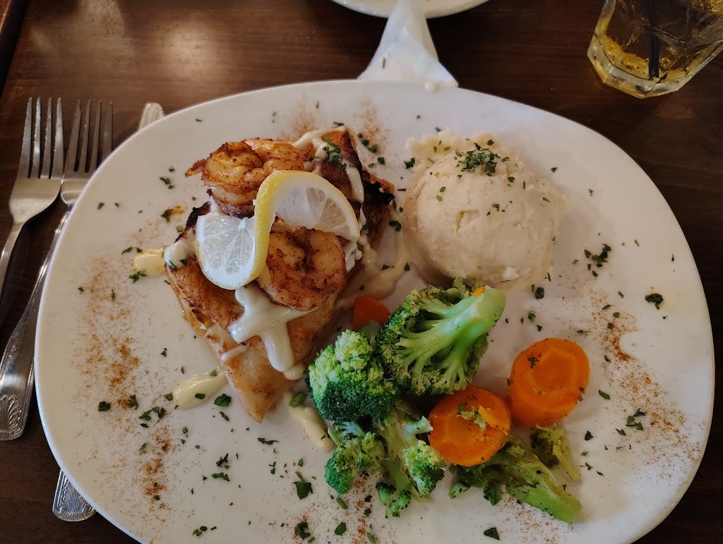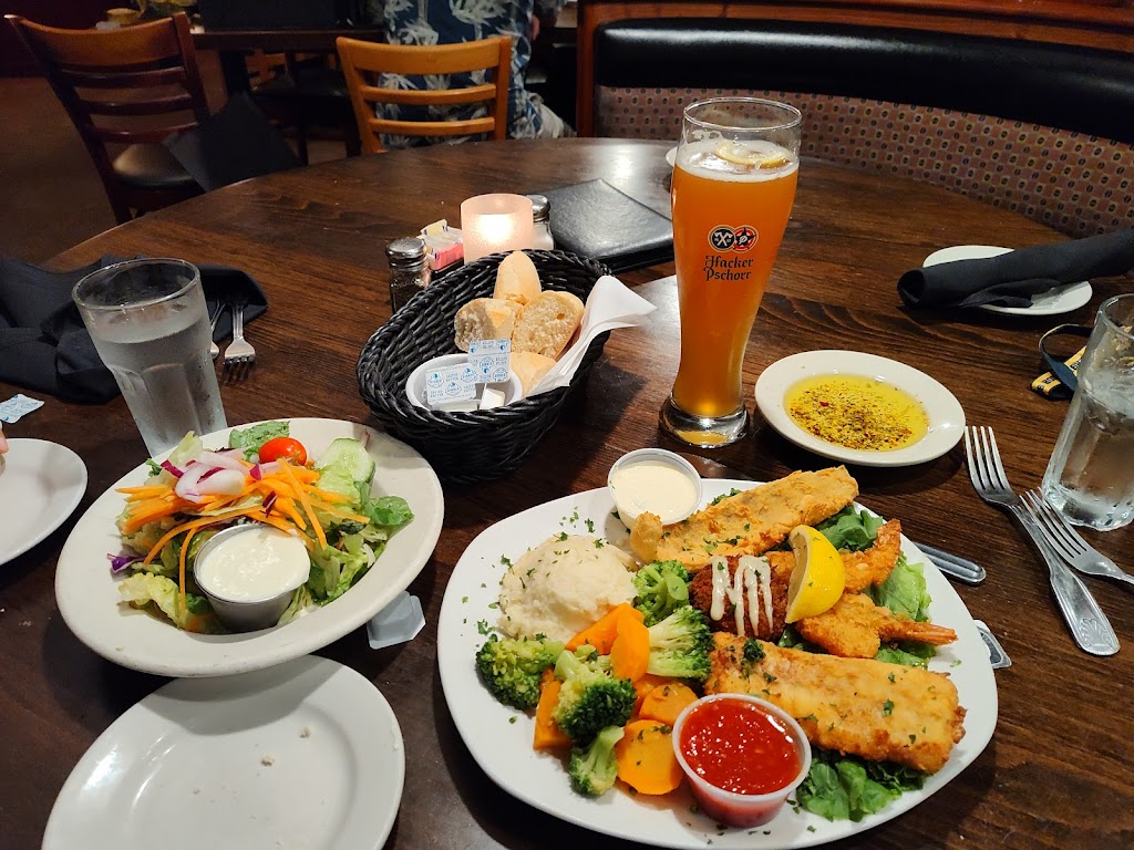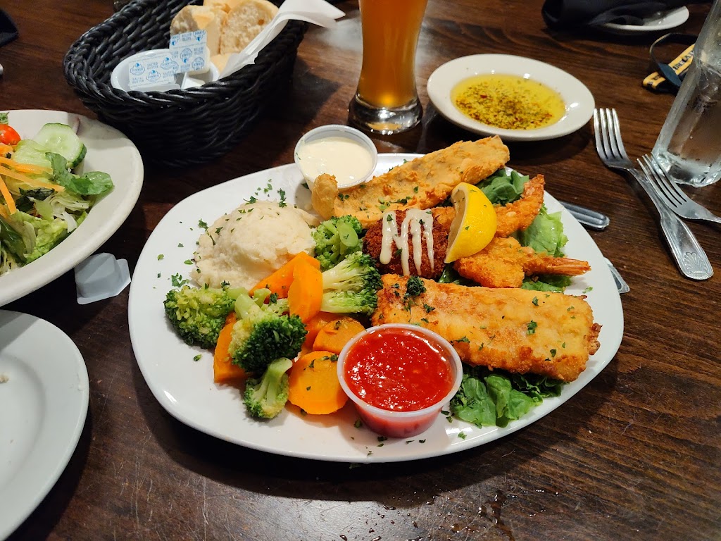 Good food, and drinks. Plenty of seating and a wife, wide variety to choose from. I had stuffed flounder with garlic mashed potatoes and veggies. Yum
