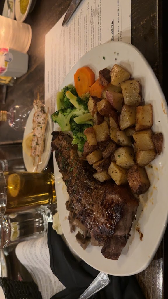 Great place with a warm lodge feel and delicious food! We had friendly servers as well. I had the rib and shrimp special with a baked potato and started with the French onion soup which is as amazing as everyone says. Ribs were amazing as well. Honestly, everything was very good including my shrimp, baked potato, salad, and my kids meals too. My kids are picky eaters but destroyed their corn dogs, Mac and cheese, and fries. Fantastic place for American and Greek food.