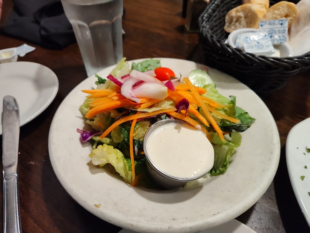 Salad that came w/ my dinner had great cheese dressing. Really enjoyed the warm bread w/ olive oil and calamari! Lobster bisque that came with my BF’s dinner, not great.