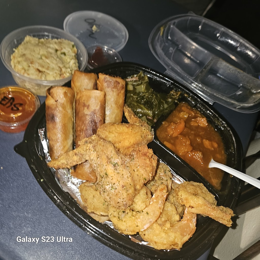 Ordered catfish dinner with dressing, greens and mac and cheese. Food was delish and service was great!