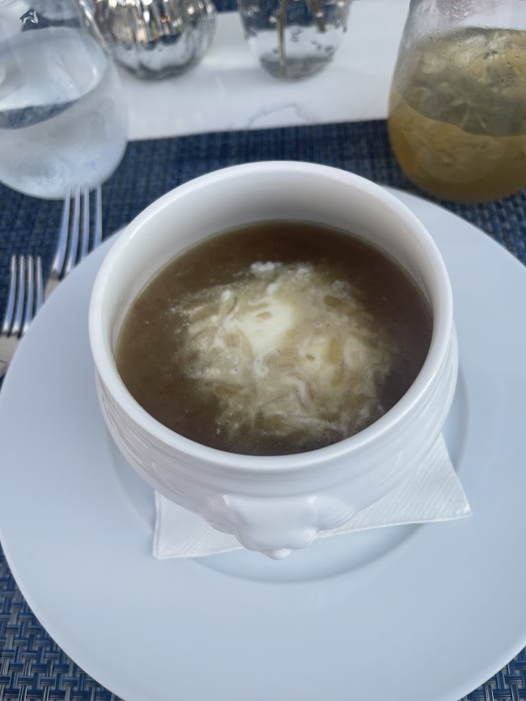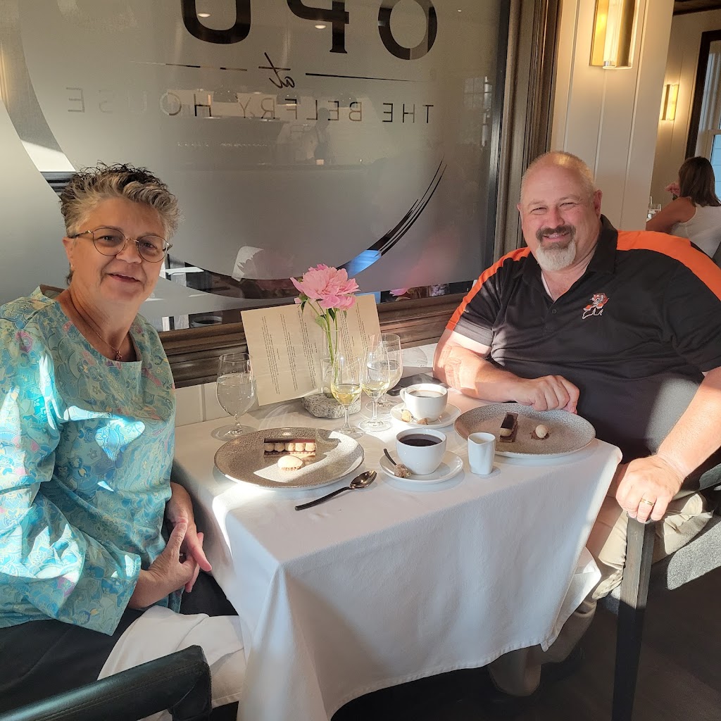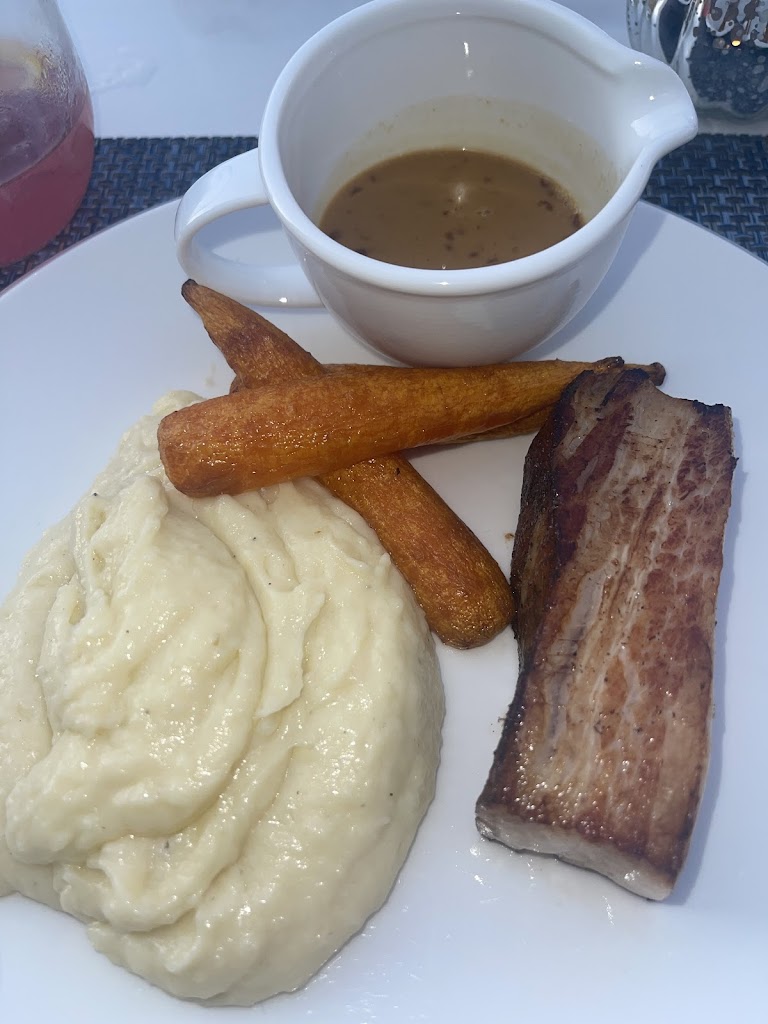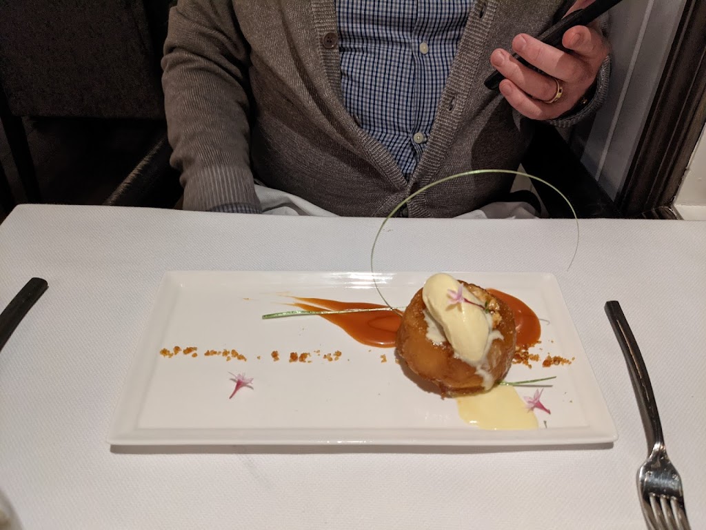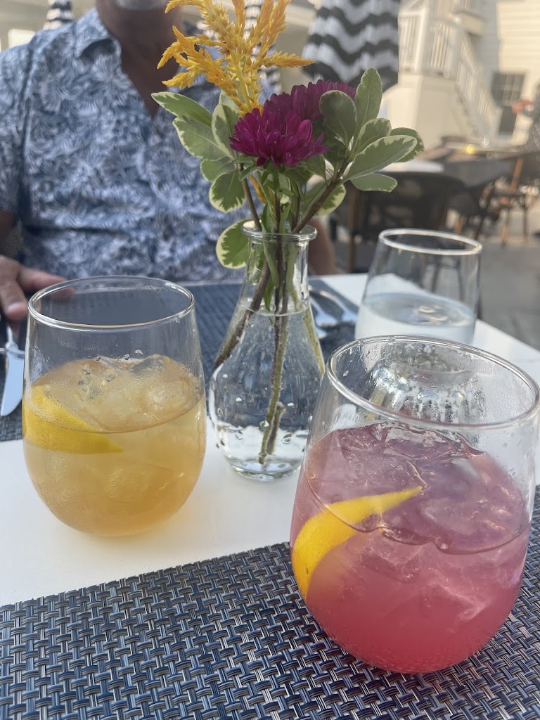 Love this charming French restaurant! (Don’t look for a sign cuz there just isn’t one) to the rear of the Belfry Hotel, we were seated on the patio (a little too close for comfort as 3 tables of 2 were immediately as if 1 of 6! … good if you are outgoing but perhaps not if looking for romance!) Beautiful setting, great classic jazz music, nice service, food and drinks were good. I loved my burrata salad, French onion lacked cheese but was good. Entrees beef bourguignon (good) and pork belly confit (Minus the requisite fat) were good. No GF dessert for me so vanilla ice cream… but hubby enjoyed a chocolate cake (which I wish was flourless…) Left right at Sunset as all the Theatre goers were arriving for a concert!