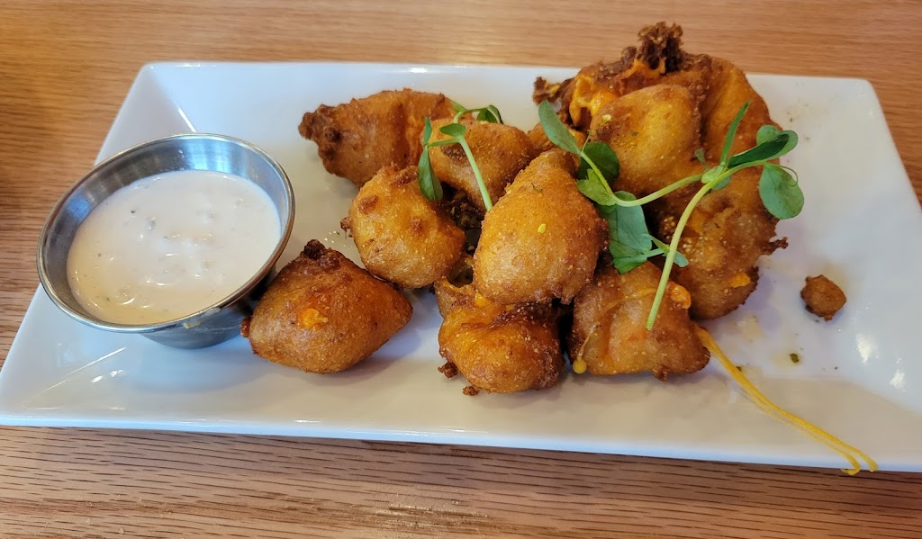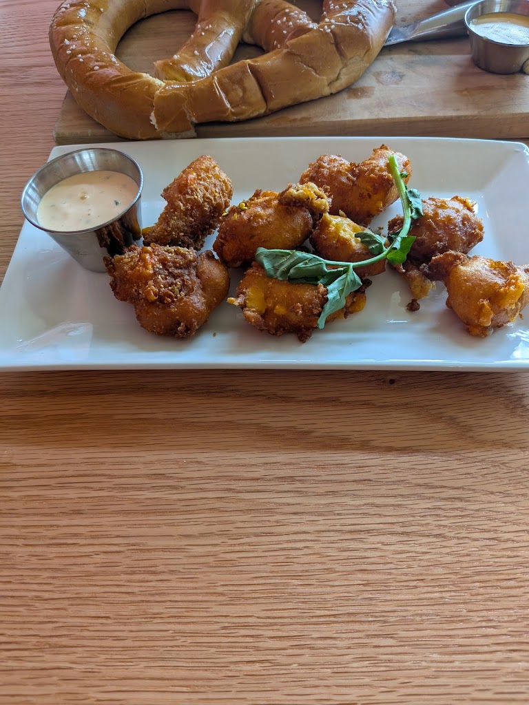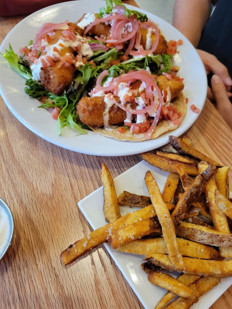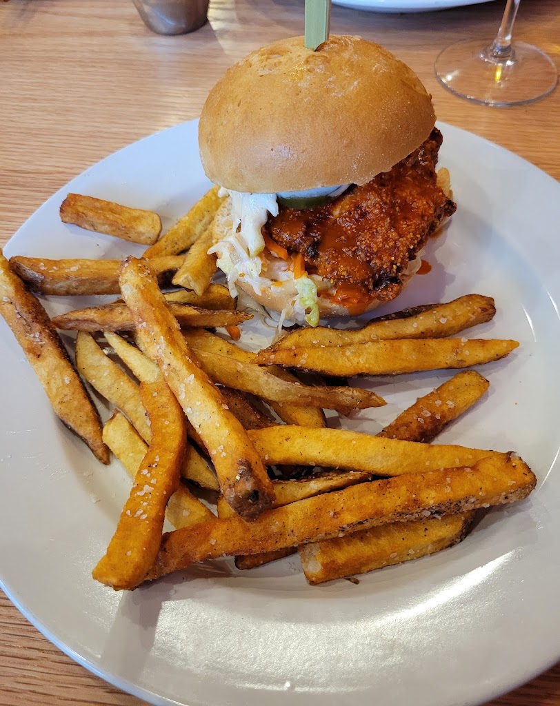 I had the n/a orange refresher to drink, and split the gluten free cheese curds and onion baji fritters appetizers with my friends. Then I had the hot fried chicken sandwich for dinner. It was amazing, very flavorful, and did I mention it was a fried chicken sandwich (it has been a long time)! My friend had the fried cod tacos, which are also gluten free, and are what I plan to have next time.