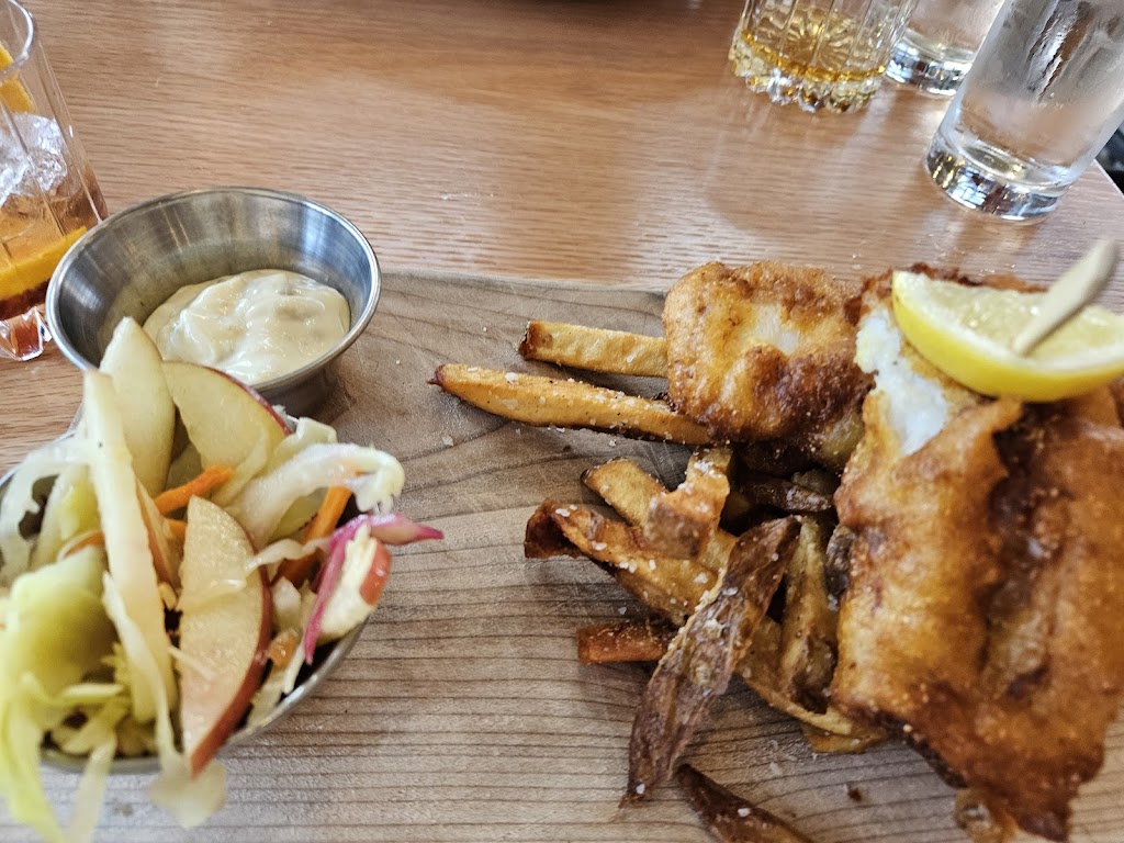The portion sizes were generous with two pieces of fried fish on top of french fries served on a wooden plank with coleslaw and tartar sauce on the side. Very beautifully presented and mmmmm... so good