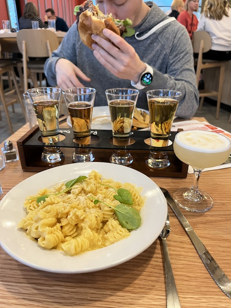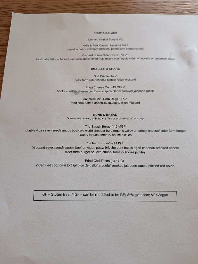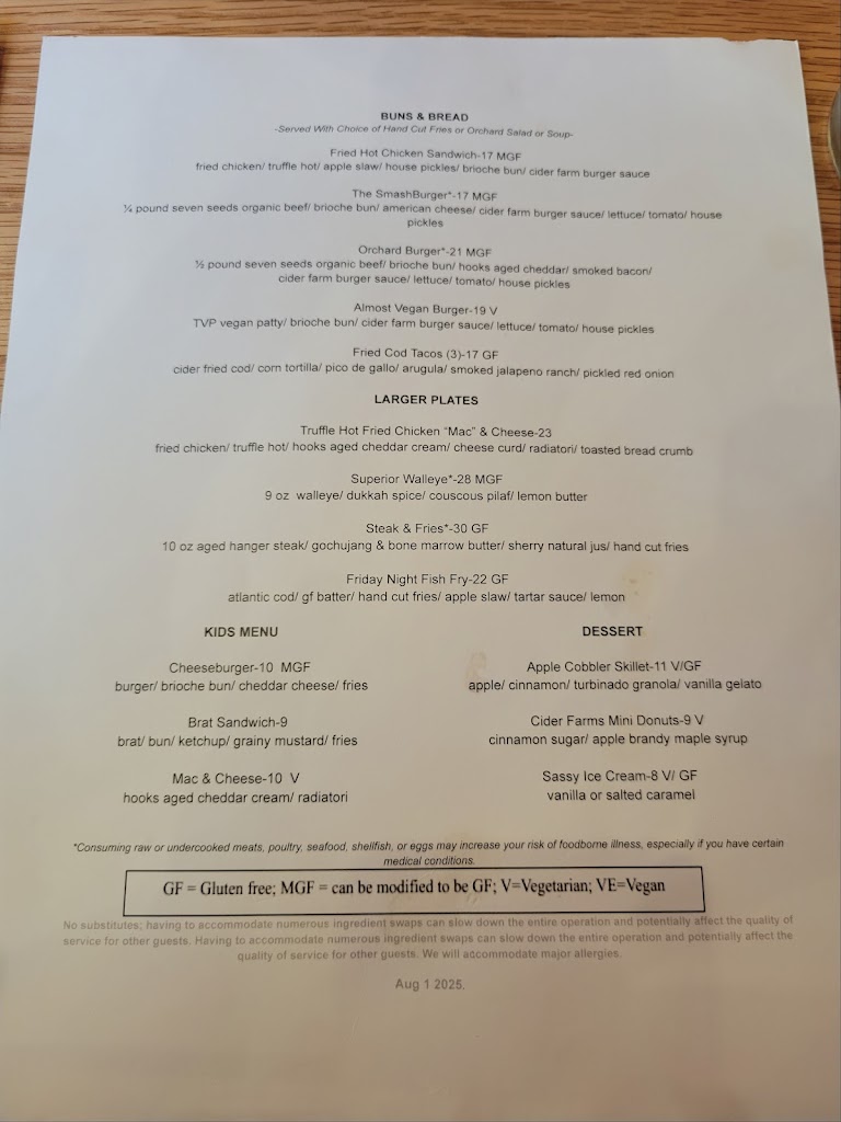 Opening weekend had a few bumps—we had a reservation that ended up being canceled due to overbooking—but we came back a few days later and had a great time. The staff were friendly and attentive and John was there to greet us as usual. We got the mac and cheese made with Hook’s cheese and the Orchard Burger, which was juicy and satisfying. The cider, of course, was fantastic and we enjoyed the cocktails as well.