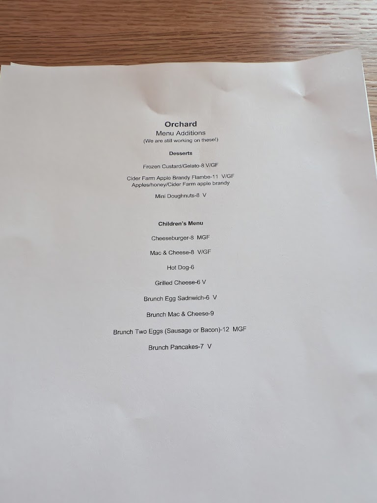 Will definitely be returning! The service was wonderful and the food was delicious! My family and I were all saying how this was the best mac and cheese we've ever had. Staff was very friendly. We loved the Orchard!!