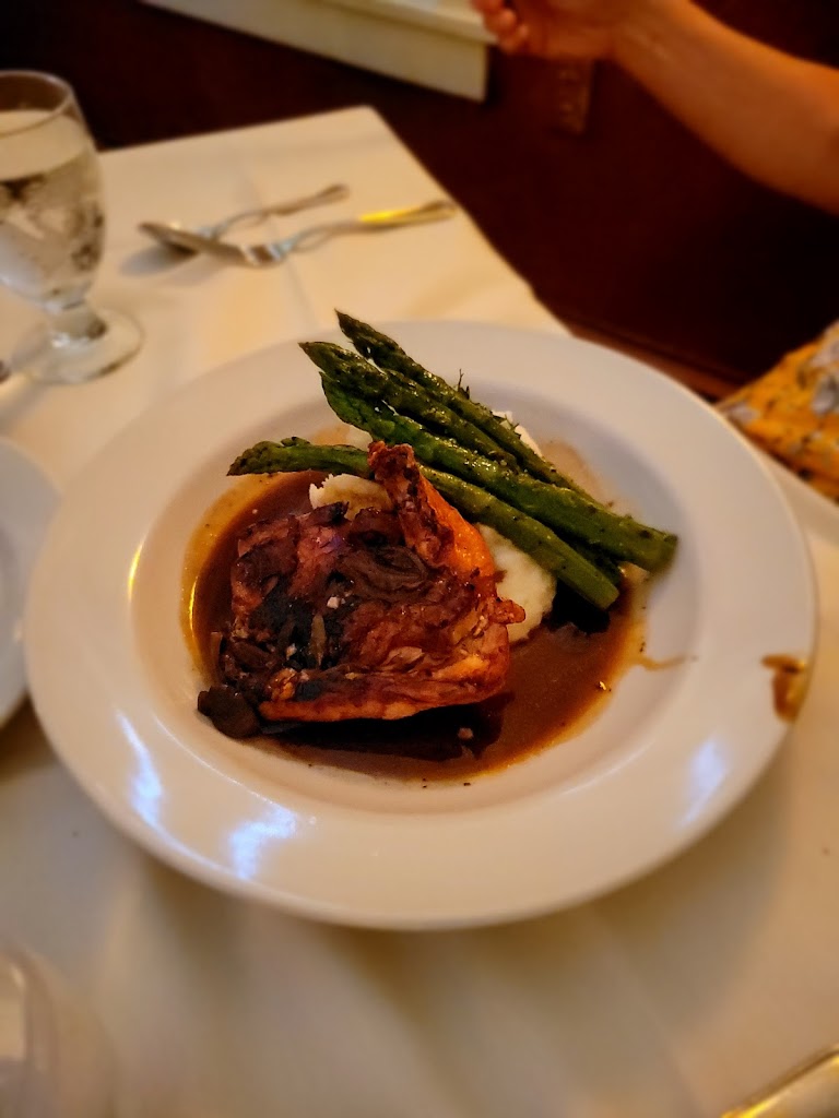 I really don't have complaints about our waitress she was fine, the other waiters were distracting and somewhat loud at times but whatever. The issue I had was that for a "fine dining" experience the food would have been sub par for a supermarket buffet. The scallops were rubbery and tough the risotto was undercooked so badly it was inedible. The Moscow mules were bitter with and without liquor in them. The chicken was dry, the asparagus was super fat and tasteless and the salad was just boring like greens and vinaigrette are a good base but on its own just bitter and difficult to eat. I thought the old building was cool but the paint chipping off the corners just screams of neglect. I wouldn't go back if it was a third the price it just wasn't good.