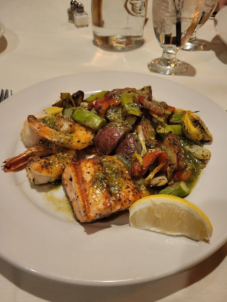 Our first time here. Stuffed mushroom appetizer was delicious. Mushroom bisque soup was tasty. Seafood trio consisted of lots of potatoes and red peppers, only 1 scallop, 2 shrimp, and a small square of salmon. It was hoping for more seafood for the price.