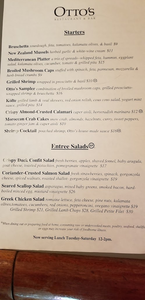 One of the best meals I have had in a long, long time. The service was incredible, the atmosphere was warm and cozy, and the food was to die for! We had the Ottos sampler. (The stuffed mushroom caps were my favorite but the prosciutto wrapped shrimp was a close 2nd. The lady had the Seabass and I had the New Zealand Lamb Chops. Absolutely fantastic. Will be back!