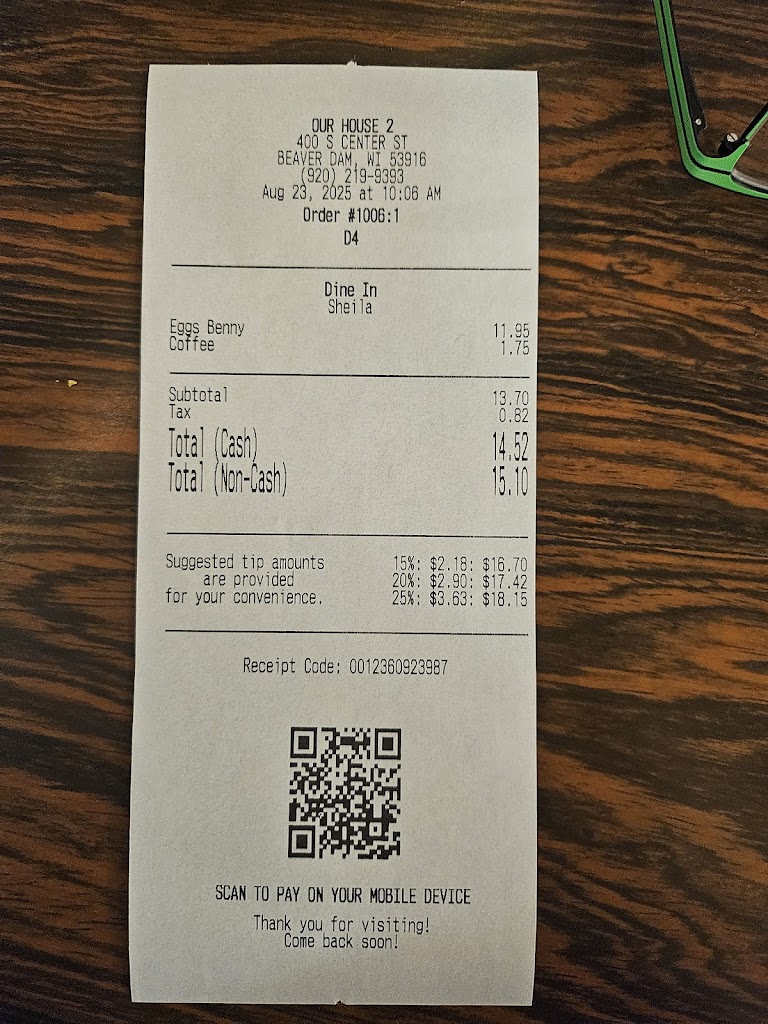 Breakfast was delicious! A good homemade savory breakfast. We are so fortunate to have this wonderful diner in Beaver Dam. It’s a gem! We enjoyed the whole experience! Definitely recommend this place!