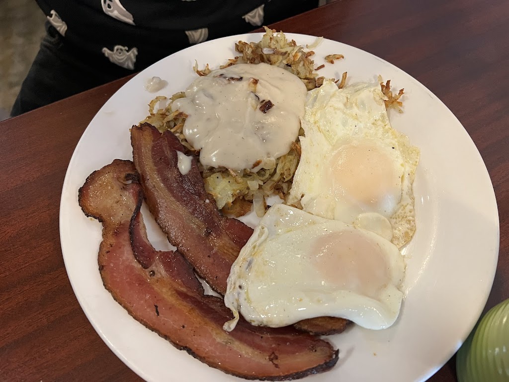 Delicious Breakfast served all day! Fresh smoked homemade Bacon can be ordered to eat, or purchased and taken home. Very friendly atmosphere and service! A must stop if you haven't eaten there🥰