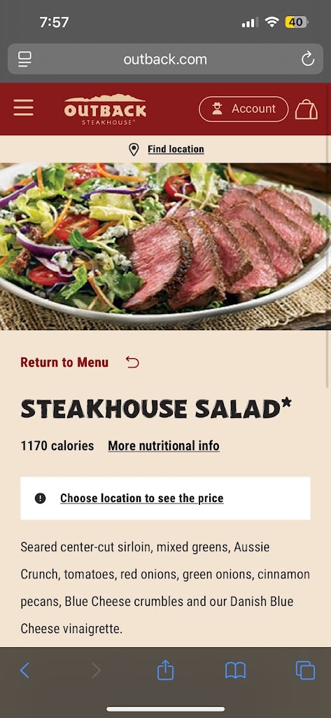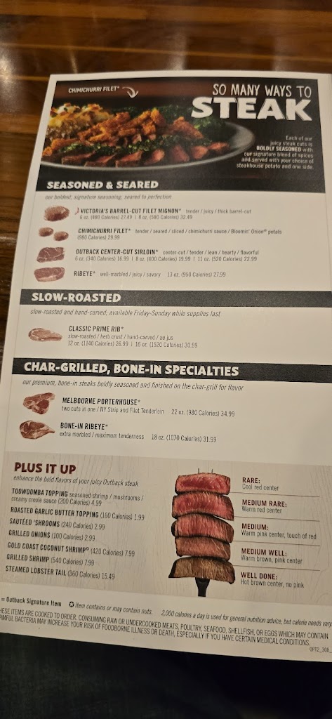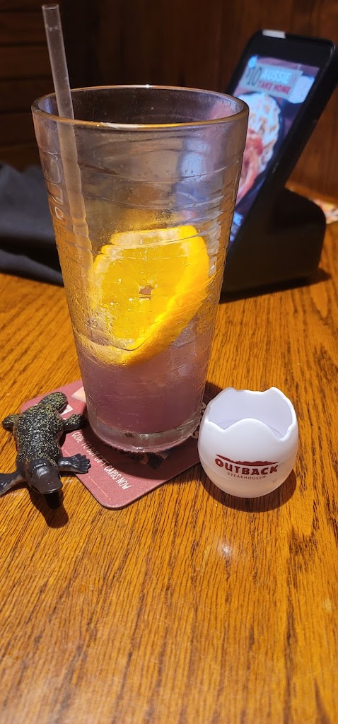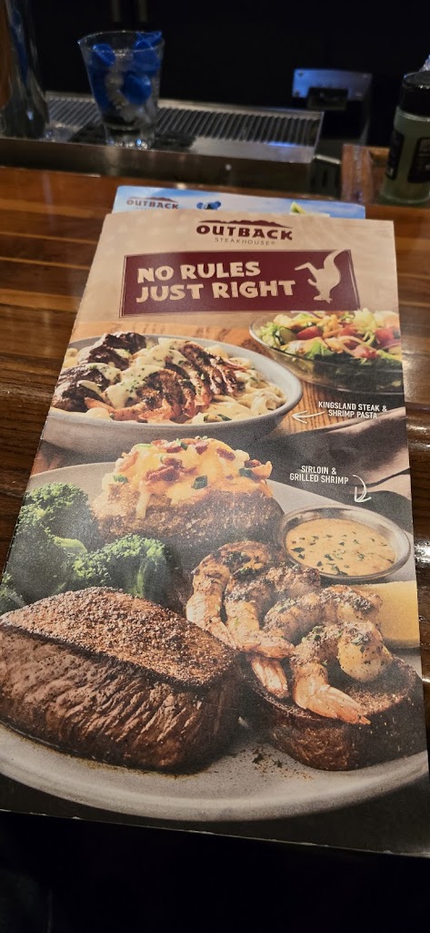 Unfortunately, we left as soon as our food was served. We got one shot at a date night without the kids and were so bummed we couldn’t have a decent meal together. It took over an hour and a half to receive our plates (very simple order, hardly any customers) and our food was cold. We had no clue who our waiter was as four different workers came to our table, hardly giving service. The blooming onion was soggy and way over salted, like all their food with watery soda. When we asked for the bill right away, we were asked rudely by one of the four workers if we had somewhere to be. Sadly, I won’t be eating at Outback again.