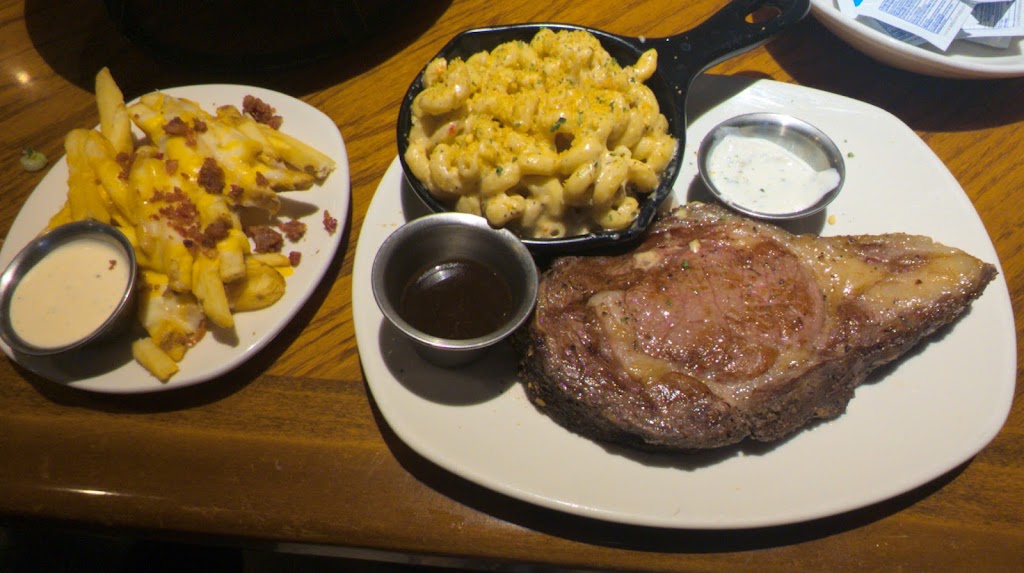 Appetizers were over fried. The blooming onion was okay tasting, but definitely over fried and only got one dipping sauce for a table of 8, we did ask for more, but none was ever brought. Mushrooms were so over fried they were so tiny and little, definitely not good. Entrees arrived, took longer than I would have expected, especially when the restaurant wasn't busy at all on a Sunday early afternoon. Being a larger party the food came out a few minutes apart, no issues there. Food was served hot and just how everyone ordered it. The food was good. The burger was good but greasy. The pasta dishes were delicious and tasted great. The steak and shrimp meals were good as well. Steaks were cooked just how we wanted. Next time the server should make guests aware the sides of onions and mushrooms are larger servings and can be shared, wasted $ on each of us ordering additional toppings when we could have shared being they came out in larger bowls. It was just really slow with service and not very attentive waitress. I mean, again, it wasn't a busy afternoon at all. We had to ask for silverware and napkins several times even after our appetizers came out before we could eat them. Getting refills on drinks took a really long time, it was like our party was forgotten about. We typically don't come to this location and think from now on will just stick to our normal location as we're never had these issues there. Not sure what it was. Our waitress didn't seem over worked or anything, she spent a lot of time at the bar talking with the bartender, so definitely just a miss on her part. Came in Sunday earlier afternoon to celebrate a birthday and during the Packer game so we knew it would be slow, thought it would be the best time but I guess not. Also, get the bathroom faucets fixed, all they do is spray water all over the place, you can't even wash your hands properly! The faucets nozzles are all broke and should be replaced. I couldn't even get warm/hot water in the bathrooms. Restaurant overall was clean.