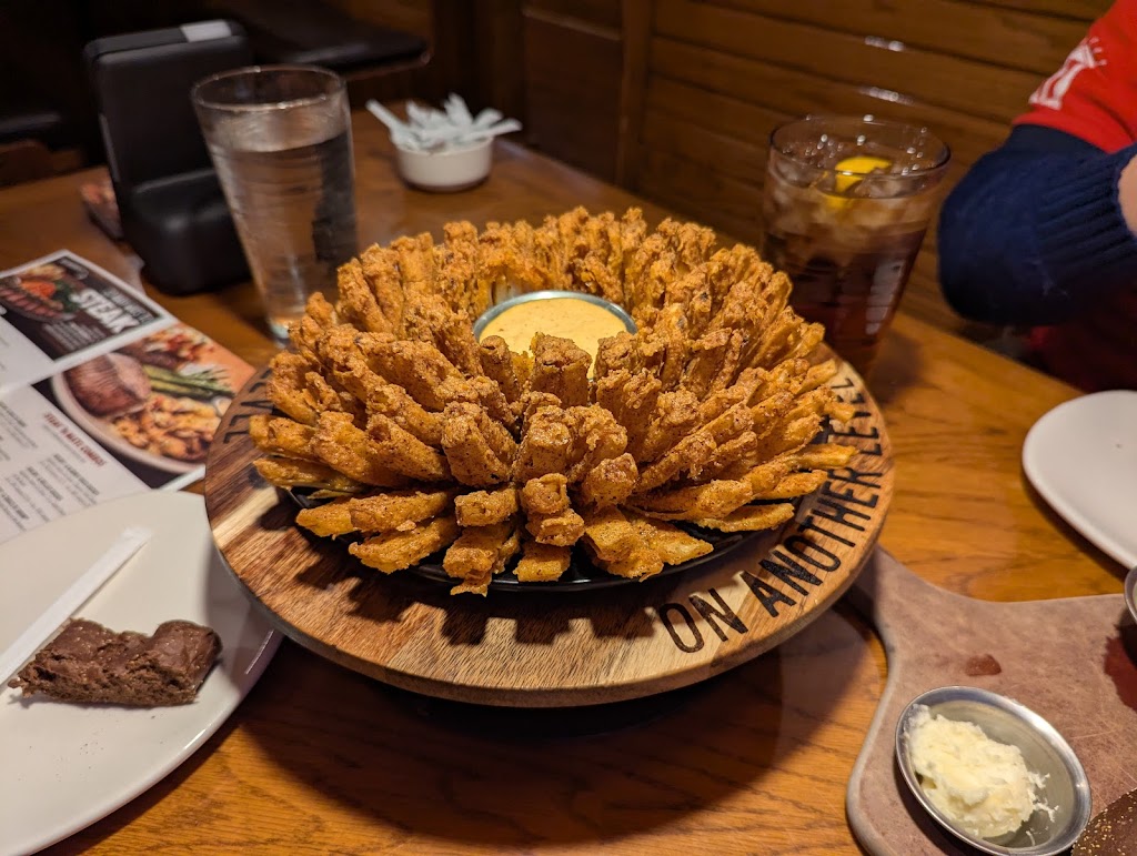 Got a blooming onion and that was a neat experience because it came on a raised platform. It was yummy and so was the boom sauce.