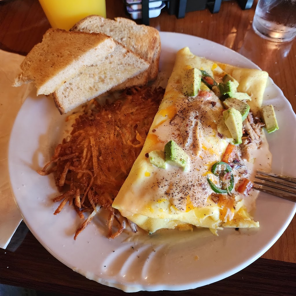 Small and quaint restaurant nestled in the heart of downtown Boulder. We stopped in for breakfast with friends and loved the experience. The establishment is decorated with lots of woodsy/cabin like items and the staff was quick to greet us upon arrival. They were busy, but not packed, and it took about 15 minutes to be seated. Service was slightly on the slow side... However, our food made everything with the wait. I ordered a jalapeΓ±o pulled pork omelet with Chipotle cream sauce and my wife a made to order omelet with bacon, ham, sausage, tomatoes, and onion. The extra ingredients were kinda expensive at $1.75 each.. but the food we got was absolutely delicious. Our meals both came with choice of either toast or pancakes and a side of hashbrowns that were made crisp to our liking. Overall, we loved our breakfast and will return when we come back through the area in the future.