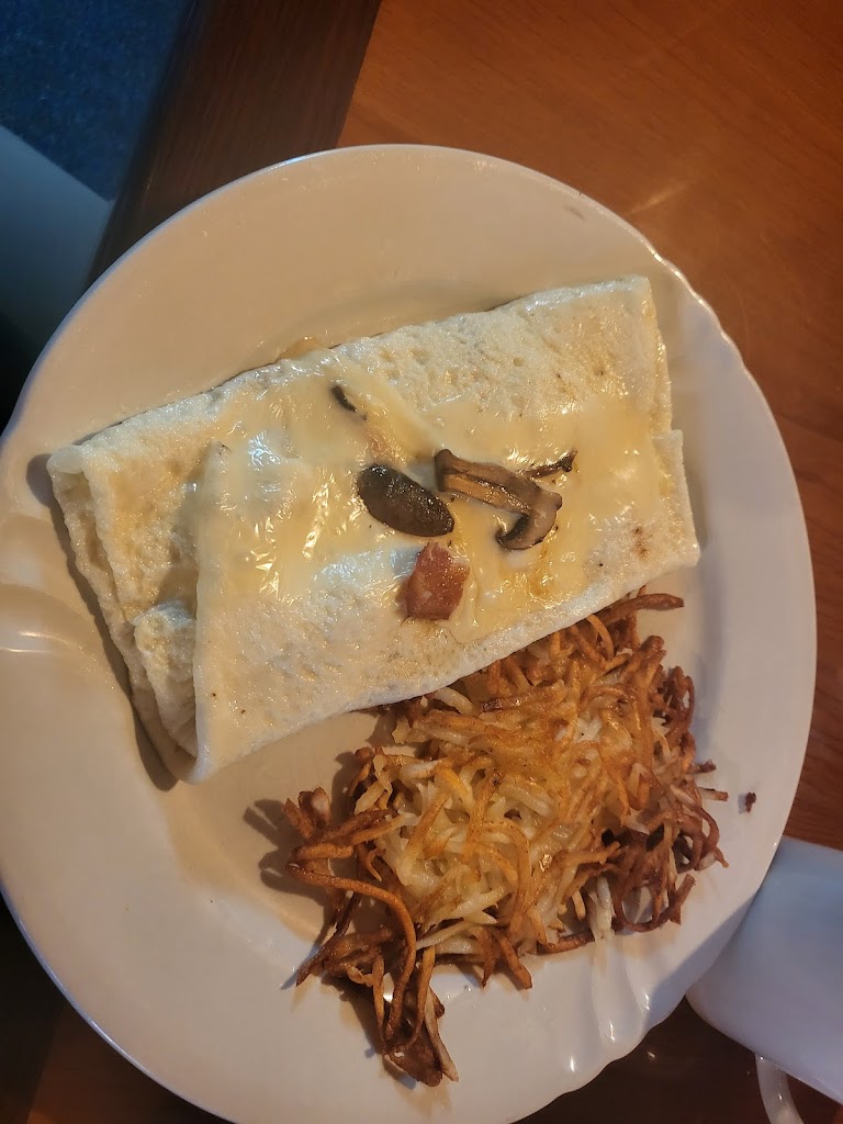 My egg white omelette, they were out of spinach, was still amazing with mushrooms and cheese. My hash browns were crispy as requested, and my pancakes were light and fluffy.