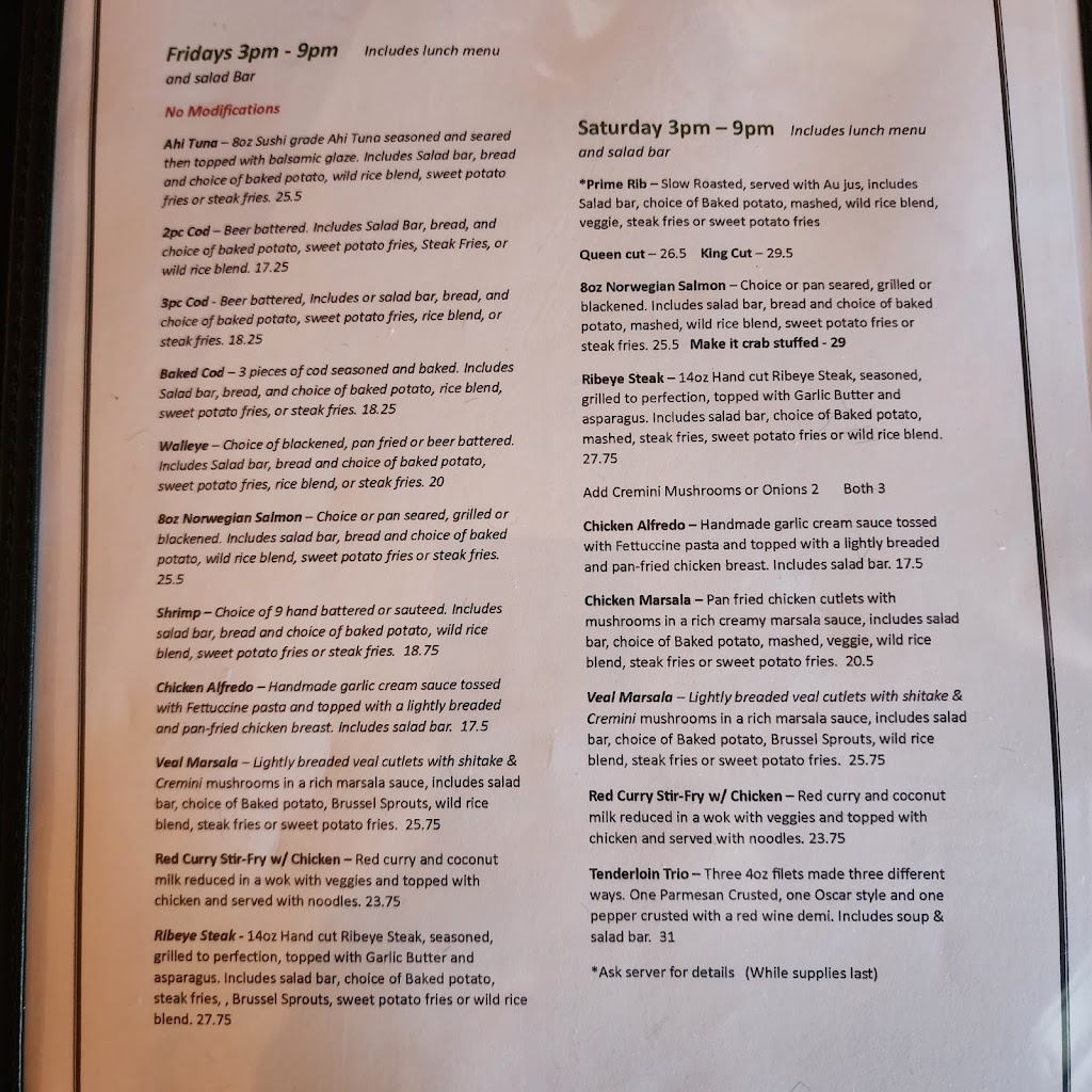 I had beer batter walleye, and my husband had a ribeye steak. Both entrees were amazing, nice salad bar and live music was great!