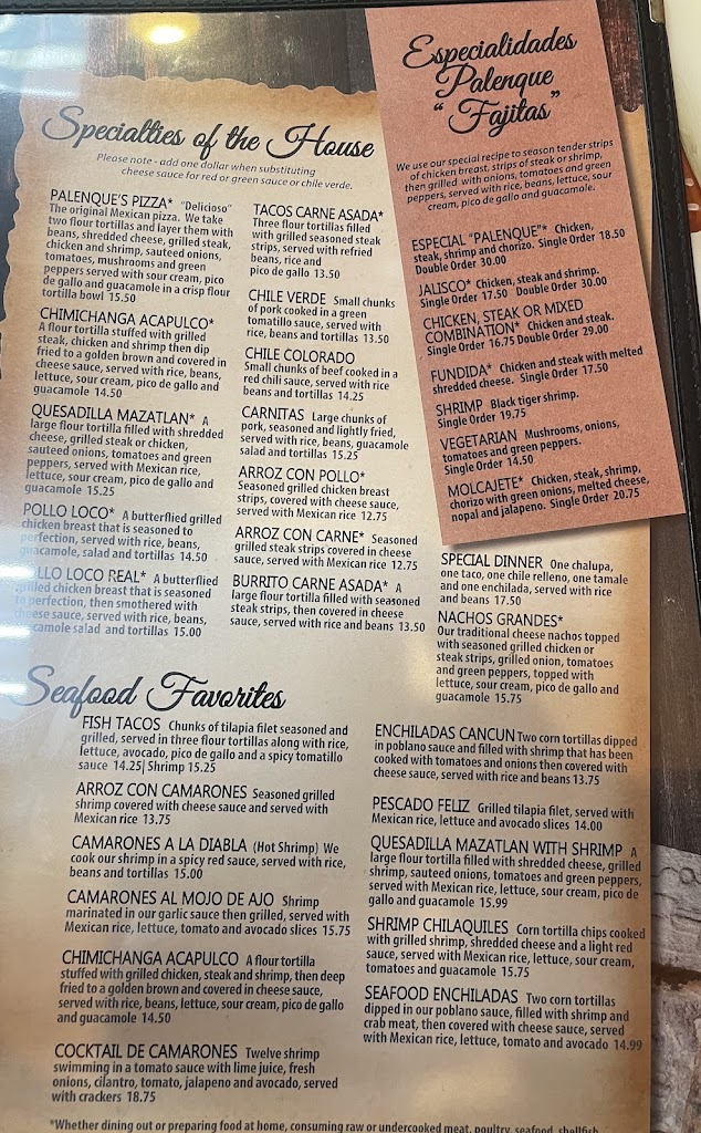 Palenque has excellent Mexican food, American kid's meals, delicious drinks, and is a family favorite. Every staff member is kind and happy to see ans serve you. Excellent place to grab lunch or dinner!!