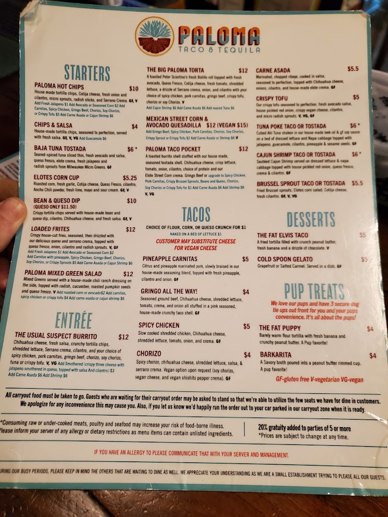 After getting seated at the bar we ordered chips, salsa, and queso and they were gone in a blink of an eye. We also ordered the house infusion margarita, pineapple jalapeno, yum! It was the perfect spicy margarita and paired well with our entrees. We enjoyed the Paloma Taco Pocket, Spicy Chicken Taco, and the Gringo All the Way! Taco. The flavors were amazing and we will definitely be back for more!