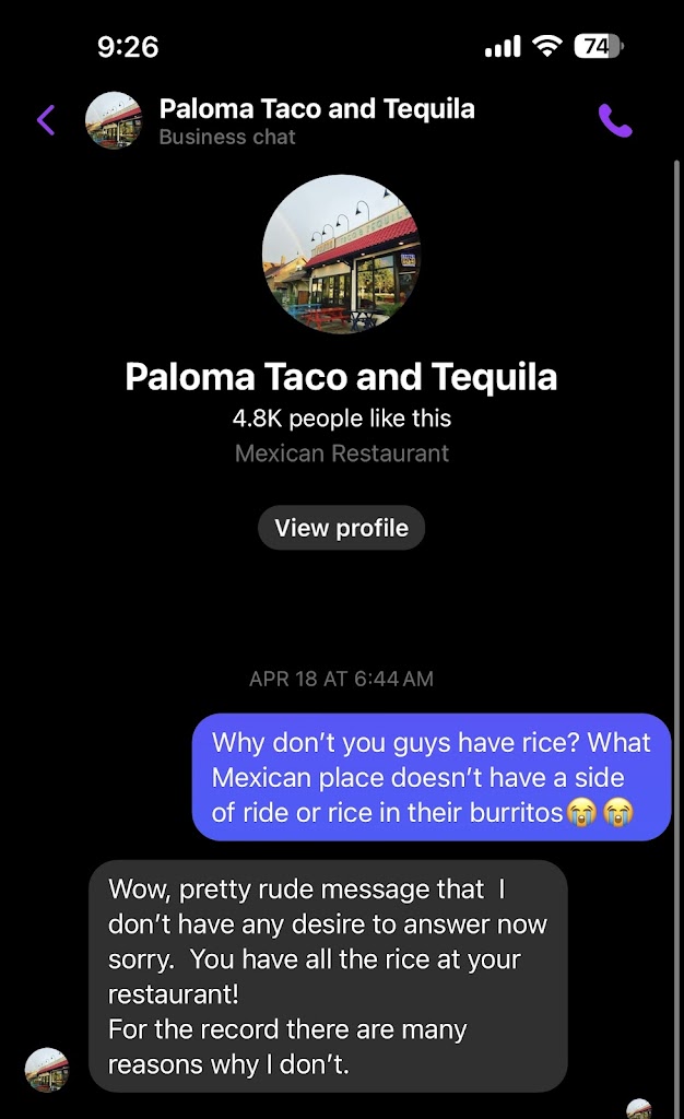 I recommended Palomas for dinner to my out of town guest because the 1st time I went there ( when the restaurant originally opened) I had the best experience. The staff and owner were so nice and attentive. The food was good and I just loved the cozy feel and concept of this restaurant! I was so excited to take my guest here! Well…I went there last night with the intent to have a good experience eat tacos and catch up over drinks, perfect! We went to Palomas sat down at a 2 person table which was fine. We were eyeing up the four person table that was empty but the waitress and bartender rudely suggested and pointed we sit at the 2 person table. Ok, no big deal. At that point there was not a wait for tables. They were probably waiting for the rush. I was not going to let the approach ruin my night! I ignored it and carried on. We ordered our food and drink and then mid dinner the staff tells us to move our table further over to the table next to us (we were literally already that close) Now we, are almost joining them! They now were going to turn the 4 table we were eyeing up into 2 tables to accommodate 4 separate guests. It was another uncomfortable situation again it was just rudely done and waitress not friendly with her approach which made it more uncomfortable. It was so uncomfortable for me and my guest and the people next to us. We were moved so close that we would have to move the table to get out. We again ignored it to make the best of our dinner. Then after we were done eating not done with our drinks or conversation, the waitress asked how we wanted the bill. I did not mention to her I was still drinking my drink I figured she already knew that. I answered her question. She comes over and tell us the amount for each of us and proceeds to processes our payment. I continue on with my out of town guest and we talk and continue sipping our drink. She comes back 5 mins later to tell us we need to hurry up due to the wait they have! We were not even there for 1 hour yet! I told her I was still working on my drink she said ok and comes 5 mins later and said our time was up! At that point, I had it! I told her how this was the worst dining experience I had ever had and I will not be back! . I would have told her not to close the bill if I knew we were going to be asked to leave. If I wanted fast food I would have picked a different place! Needless to say my night ended early and it was an embarrassment! I don’t wish this experience for anyone!