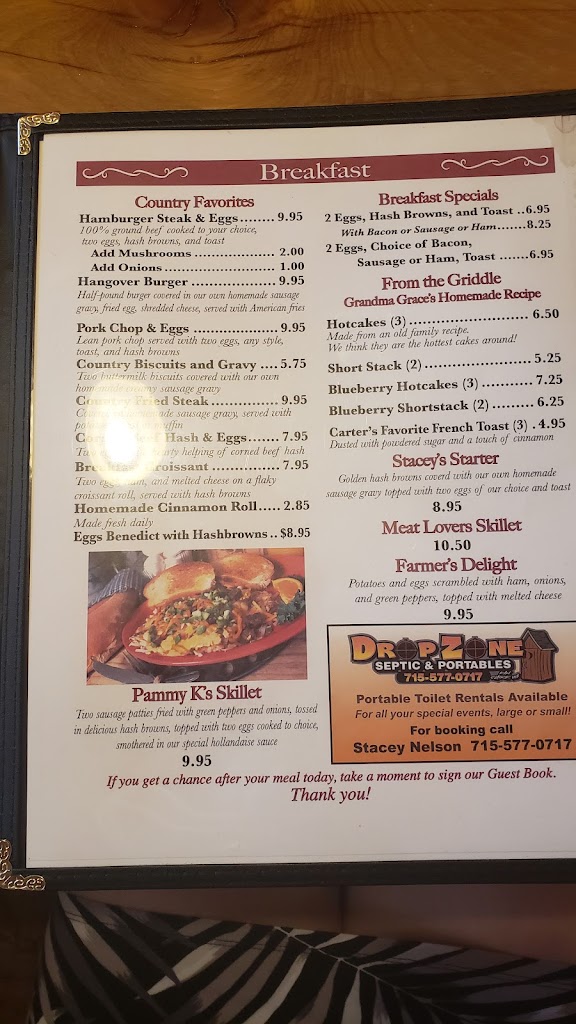 This is a cute little dinner with an incredible atmosphere. The food is delicious and reasonably priced. The homemade cinnamon roll amazing! And the homemade bread for the skillet is a great touch. They always decorate different for each holiday and it’s so cute. Wide selection of pies. Staff always friendly. Love the extra touches. Well worth the countryside drive for a morning breakfast that hits the spot and puts a smile on your face. Love the fact page for learning while I wait for my food. Favorite part. Find yourself having an experience at Pammy Ks.