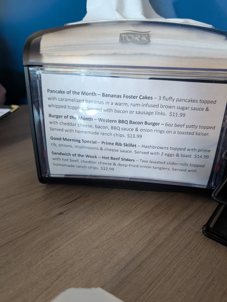 Absolutely a great time. First timer, passing through. Specials were fantastic and the flavor of what ever I had was perfect with a little hot sauce and home made wheat bread for an extra .25 eggs, has browns and meat were fresh!!!
