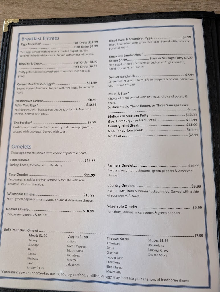 Hands down the best place for breakfast in the Wis Rapids area. No particular dish as they're all delicious... eggs benedict, taco omelet, brewers skillet, biscuits & gravy, you name it. Yum!