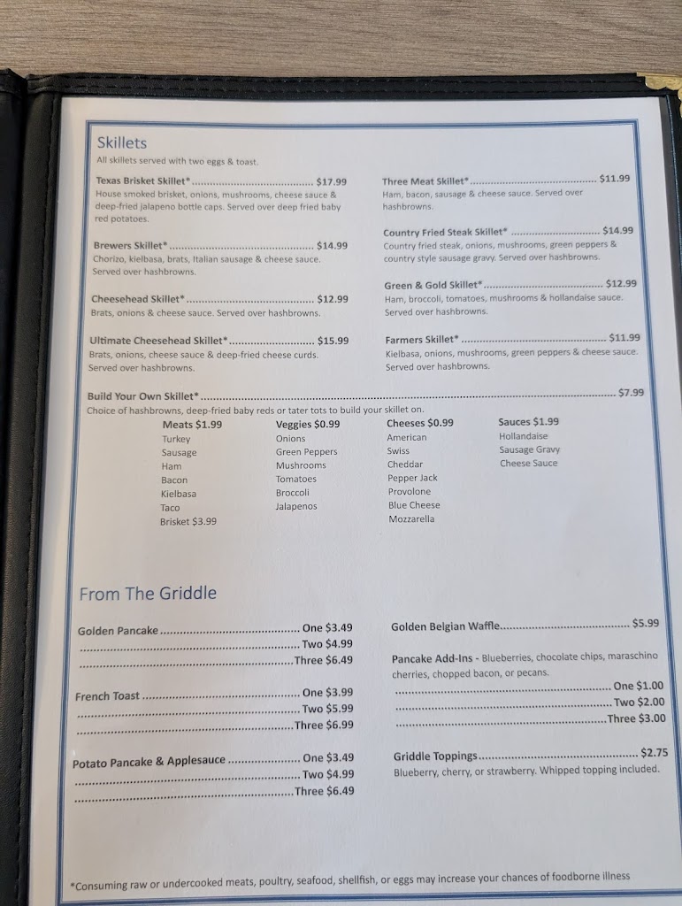 Cute place, good food, friendly staff. I had the Cheese head skillet I would get it again!