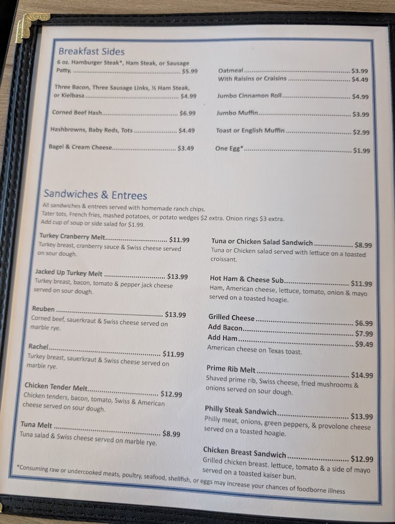 Stopped for 1st time. Food and service were great. Everyone was friendly. Homemade bread was delicious. Plenty of options on the menu. Will definitely be back to try other things on the menu.