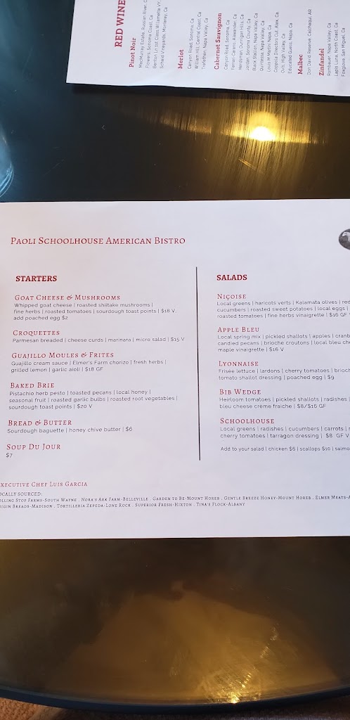 My wife and I dined at the Paoli American Bistro and were amazed by the quality of the service and the food/wine selection. We tried the sea bass and it was perhaps one of the best presentations of this fish selection we have enjoyed anywhere. And to think, the middle of Wisconsin. The food and beverage menus offer a wide range of options, but we shared the bread/butter appetizer, the spinach salad, the sea bass and a butterscotch budino (one of the best we have had anywhere as well). Our only disappointment was that Brian, our outstanding server, would not disclose the budinio recipe, but we understand his position. If you are in the area and looking for an outstanding option for lunch or dinner, we highly recommend the American Bistro.
