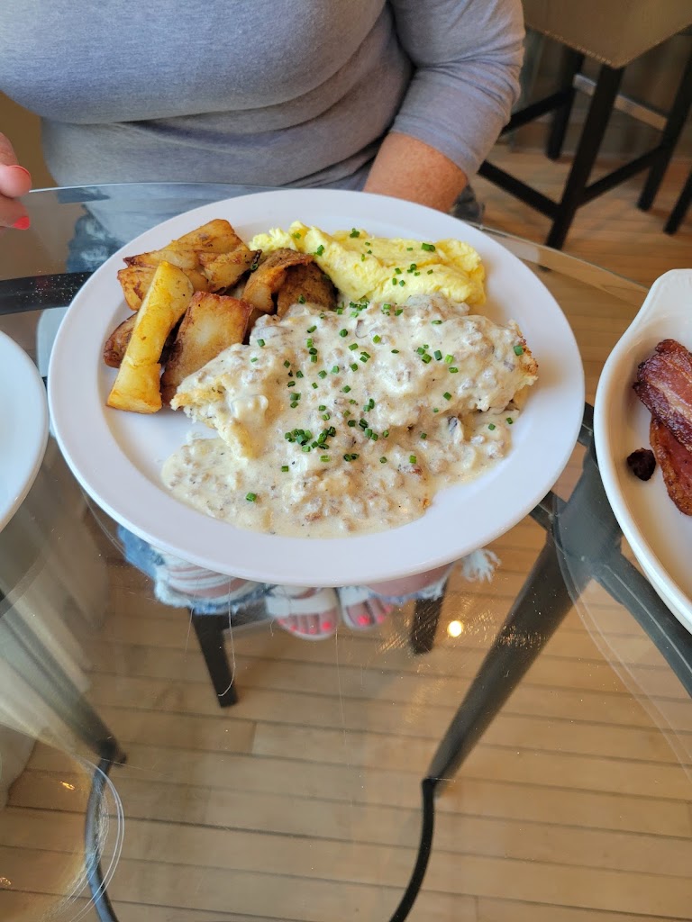 Came here on a Sunday morning a little after they opened with a couple other people and people that came in after us received their food before we did. When we finally did get our food, the biscuits & gravy with over easy eggs were cold (not lukewarm) and not edible. The side order of bacon had been sitting for a good while as it was cold, too. French toast with truffle fries were lukewarm. The alcoholic drinks we ordered were great, at least. Not too boozy and not too weak. Our waiter took the biscuits & gravy item off our bill but not the bacon. No manager came over to apologize for the cold food, or anything (we did bring it up to our waiter's attention). We most likely won't be coming back as this was our first time ever eating here.