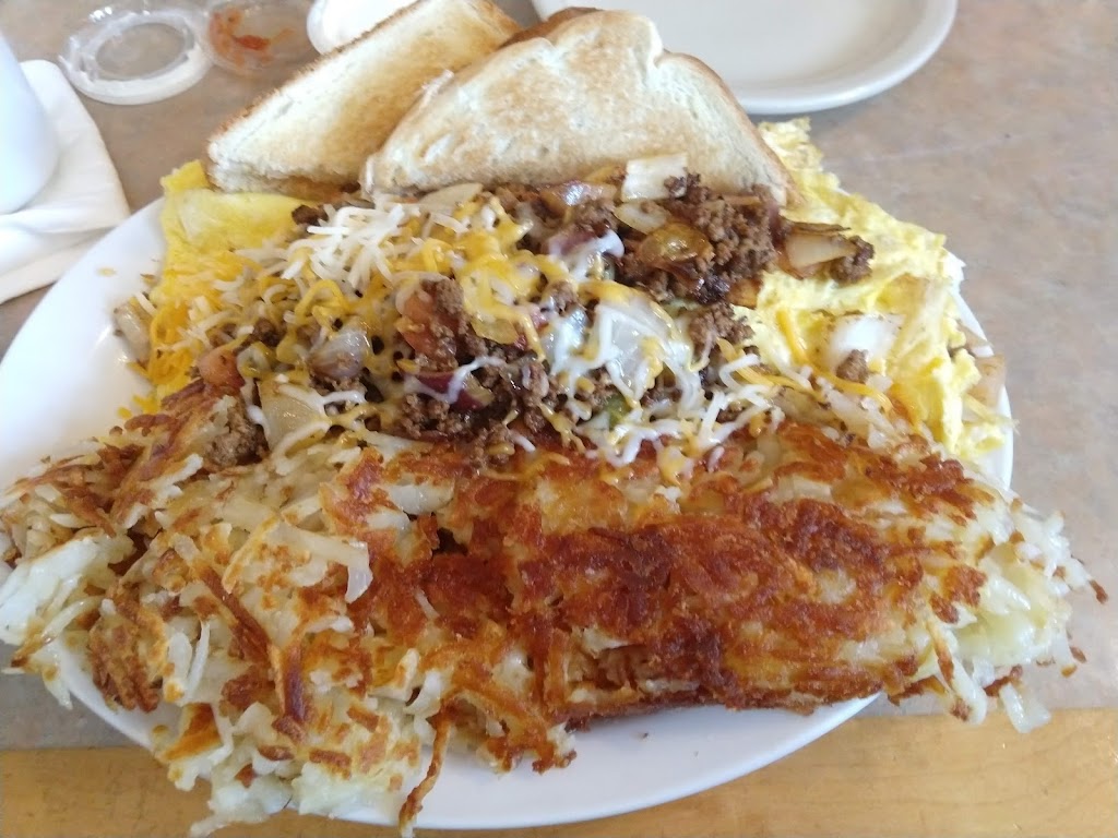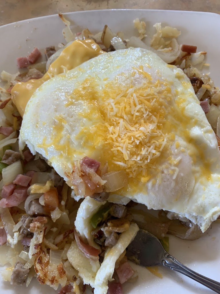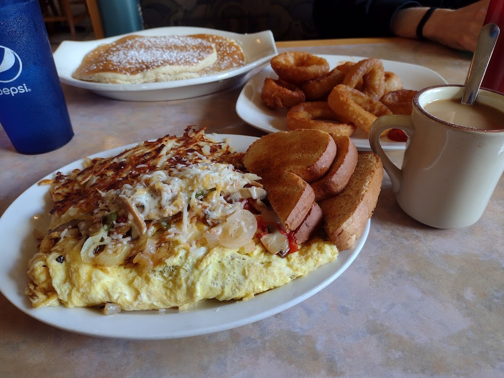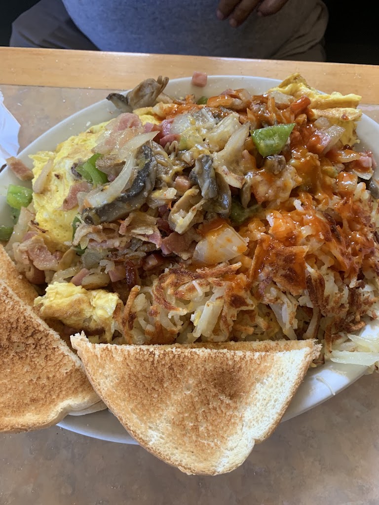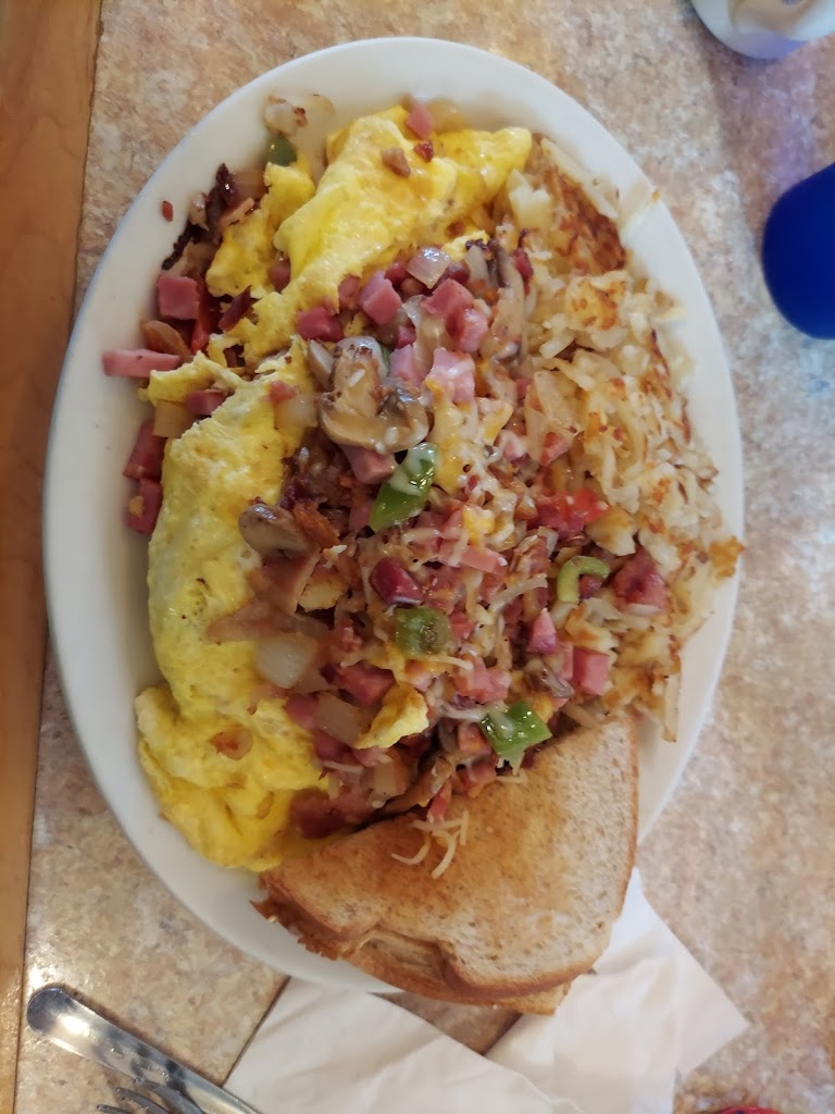 OMELETS are made when you fry up sausage mushrooms onions green peppers bacon then you spread the eggs and put all ingredients in the middle add the cheese and fold it over and sprinkle little shredded cheese on top ! Now that's a OMELET ! NOT NOT everything cooked in the eggs and folded over and cheese on the top ! THAT IS A SCRAMBLER IN MY OPINION! NOT A OMELET! I will not go there again ! Its really not how much food you get on a plate, it's the quality of the taste that makes it a full plate !