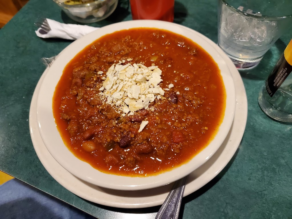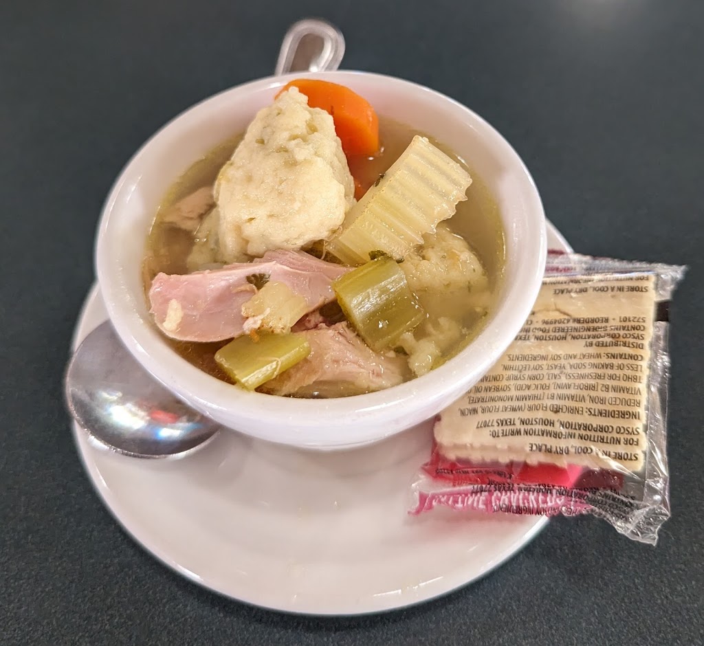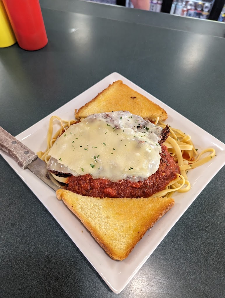 My friend had a Mushroom Swiss Burger and Fries and said it was great. I had a cup of Chicken Dumpling soup and Chicken Parmesan on noodles. The soup was good, not great but good. I didn't really like the chicken parmesan. The chicken itself was huge and prepared well, I didn't like the sauce or the noodles.